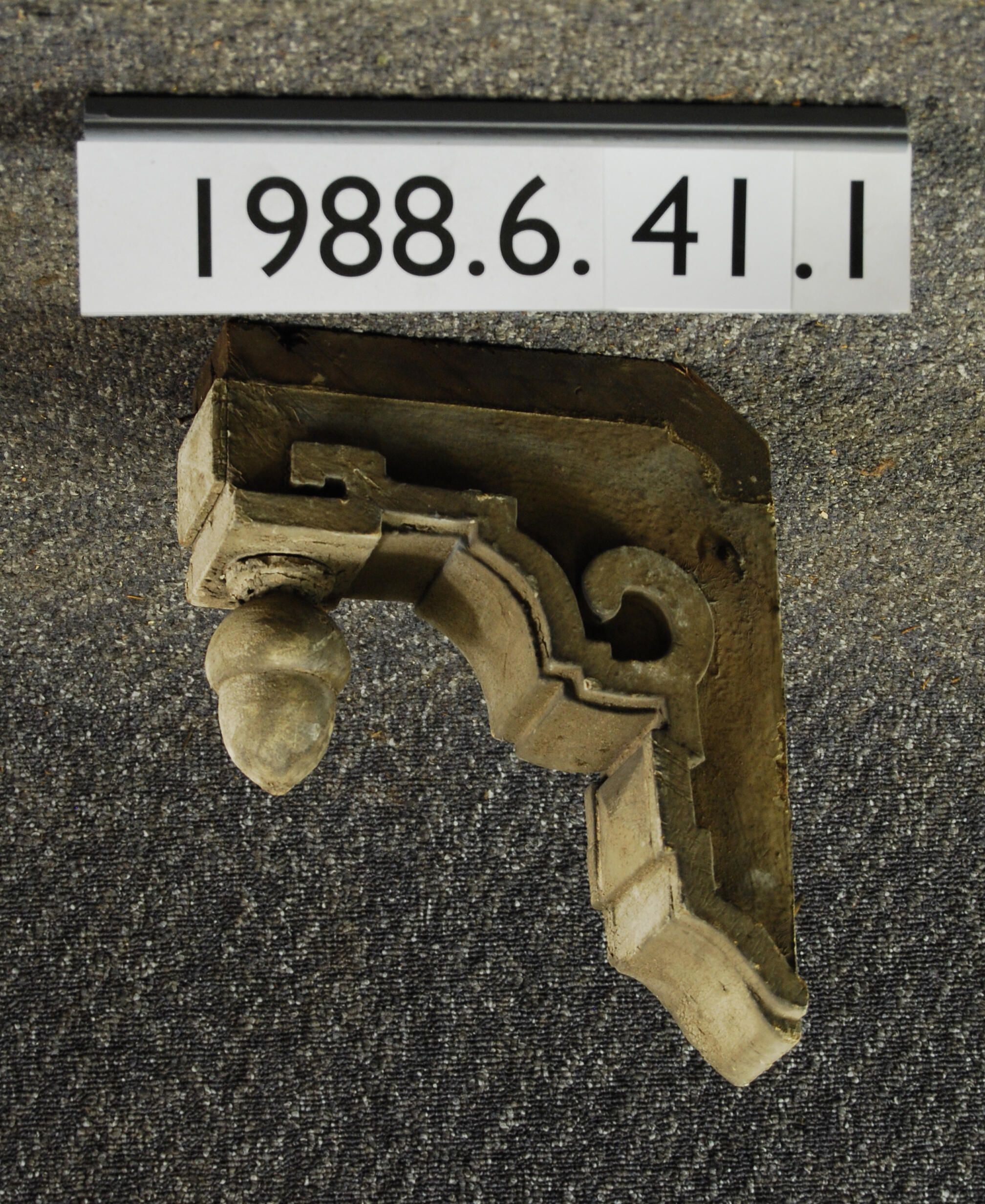 Wood bracket. Scrolled sides. Greek key ornament on each side. Acorn drop ornament . Painted yellow. Inscriptions or Markings: Manufacturer: Place of Manufacturer: Design motif: Style: Finish: Painted