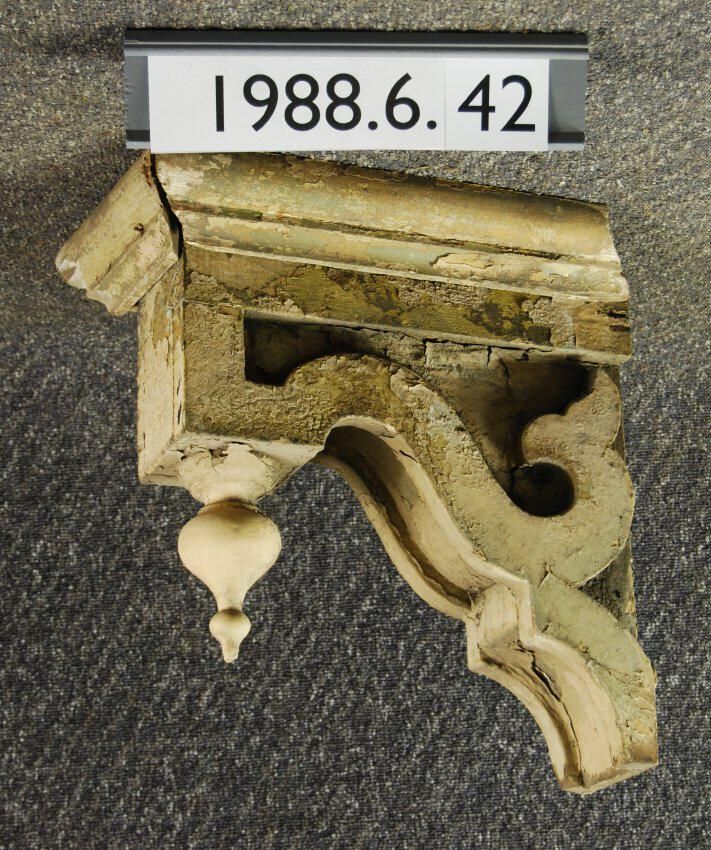 Wood bracket. Scrolled sides. Has onion shaped drop ornament. Moldings at top edge. Painted yellow. Inscriptions or Markings: Manufacturer: Place of Manufacturer: Design motif: Style: Finish: Painted