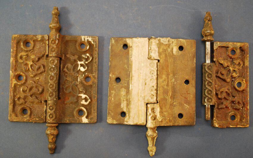 Design Name: Manufacturer: Unknown Style: Neo-Grec Material: Iron Manufacturing Method: Cast Surface Finish: Painted VDA Classification: VDA Number: Shape: Patent Specifics: Lock Type (If Applicable): Inscription/Makers Mark: Inscription Text: 4 x 4 Comments: Fixed joint, steeple tip. Includes two hinges (one with missing tip) and one matching leaf.
