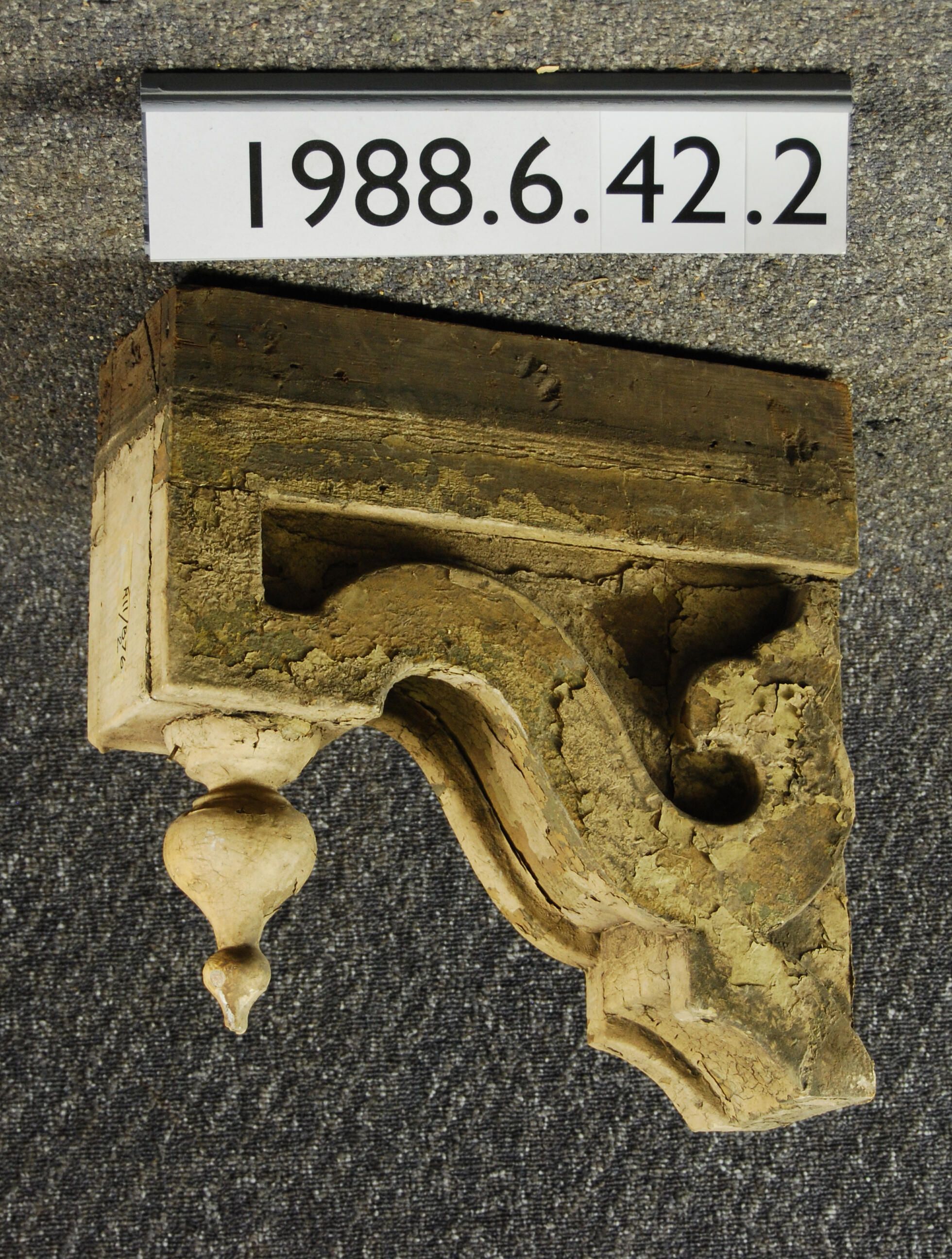 Wood bracket. Scrolled sides. Has onion shaped drop ornament Has one moldings at top. Painted yellow. Inscriptions or Markings: Manufacturer: Place of Manufacturer: Design motif: Style: Finish: Painted