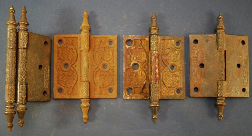 Design Name: Manufacturer: Unknown Style: Neo-Grec Material: Iron Manufacturing Method: Cast Surface Finish: Stripped VDA Classification: VDA Number: Shape: Patent Specifics: Lock Type (If Applicable): Inscription/Makers Mark: Inscription Text: 3 1/2 x 3 1/2 Comments: Fixed joint, steeple tipped. Remnants of paint. One with variation on reverse.