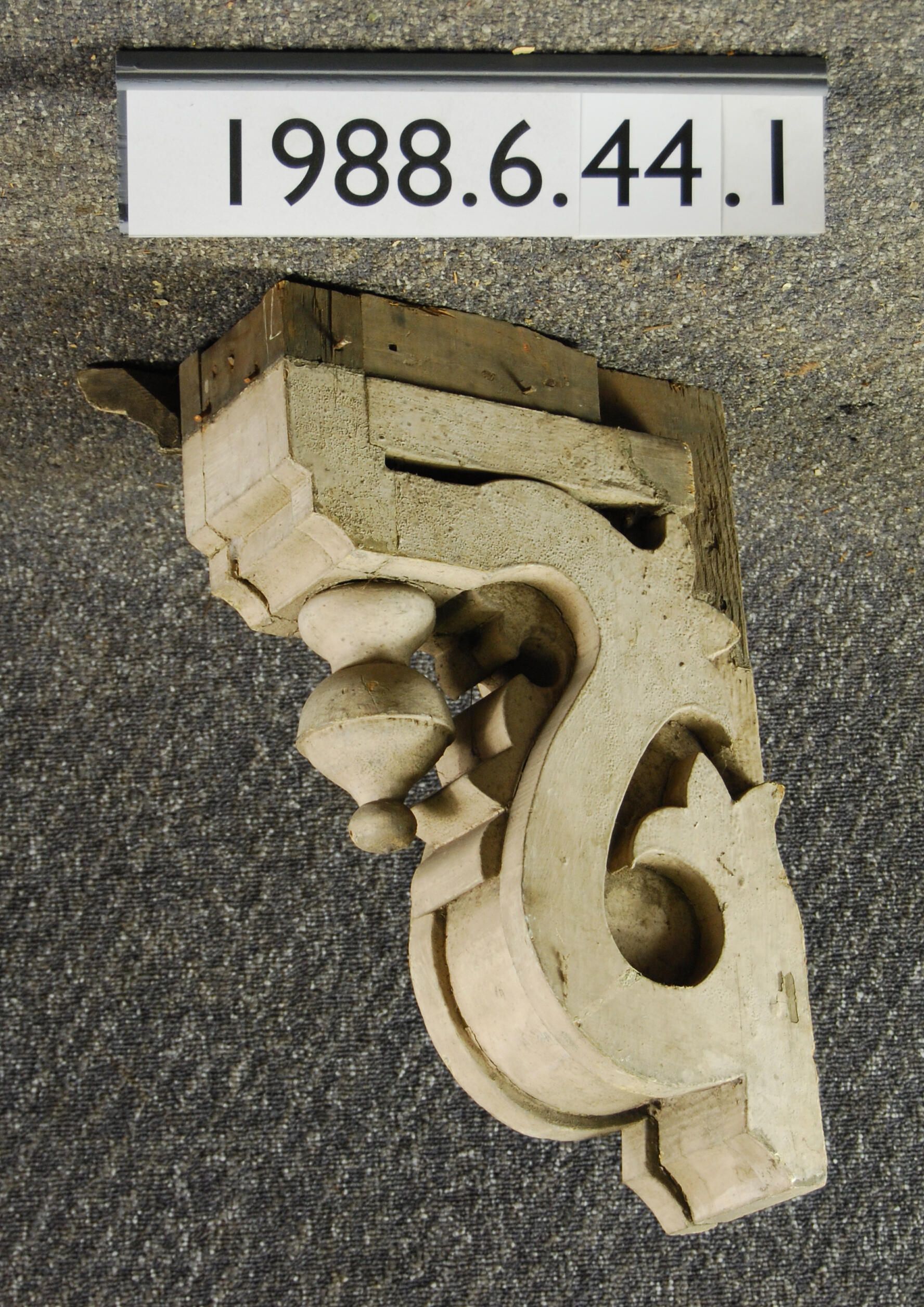 Wood bracket. Scrolled sides. Has drop ornament. Botanical ornament on front. One molding at top. Painted beige. Inscriptions or Markings: Manufacturer: Place of Manufacturer: Design motif: Style: Finish: Painted