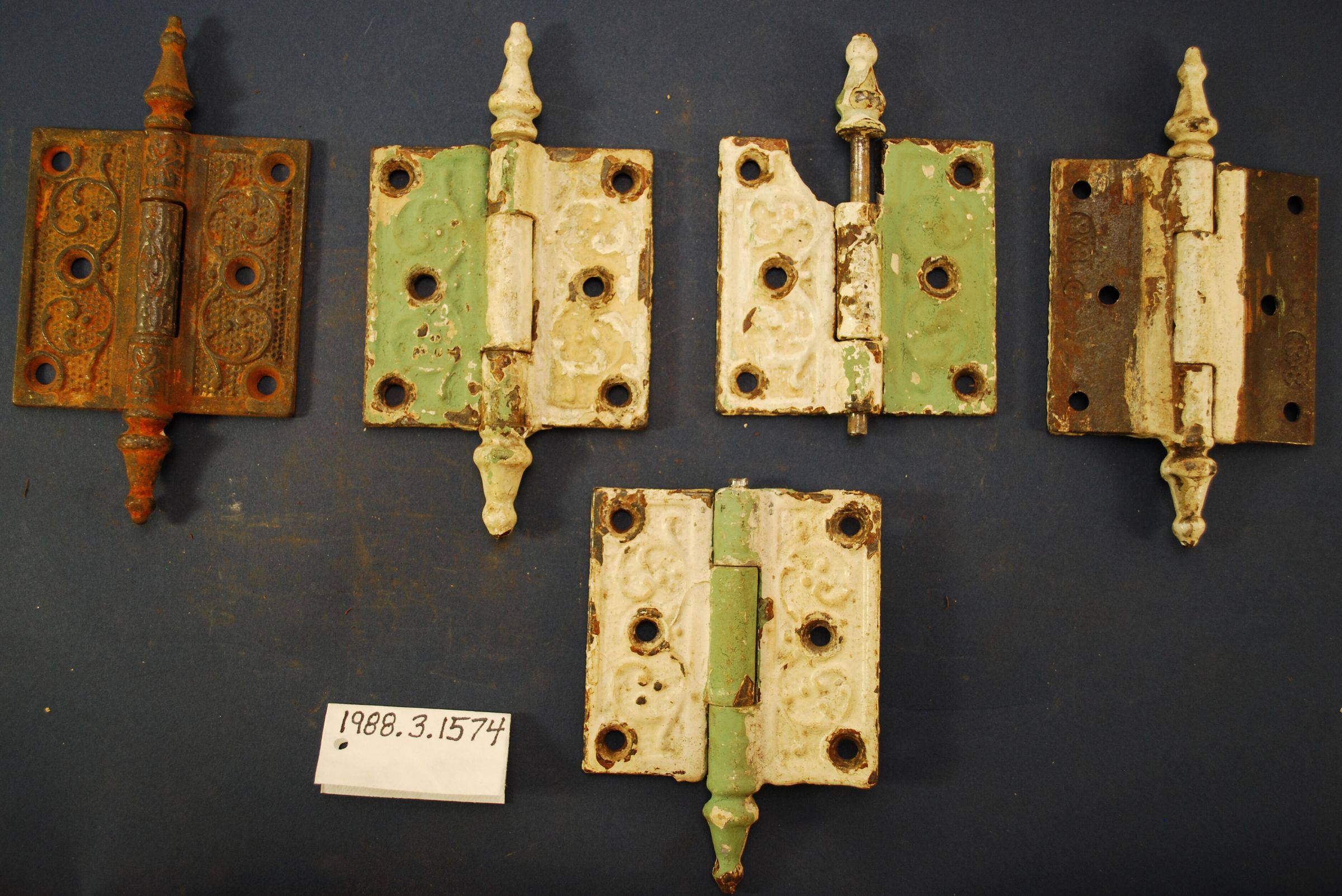 Comments: Fixed joint, steeple tipped. One with truncated leaf, one is missing tip, could be combined to make whole hinge. (One is Poor condition, one with no finish.)