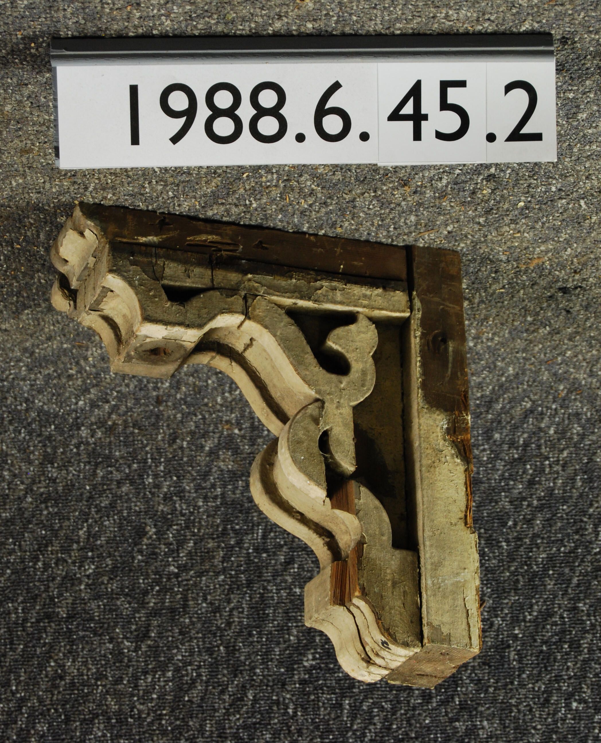 Wood bracket. Scrolled sides. Drop ornament missing. Has one molding at top. Painted beige. Inscriptions or Markings: Manufacturer: Place of Manufacturer: Design motif: Style: Finish: Painted