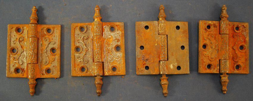 Design Name: Manufacturer: Unknown Style: Neo-Grec Material: Iron Manufacturing Method: Cast Surface Finish: Stripped VDA Classification: VDA Number: Shape: Patent Specifics: Lock Type (If Applicable): Inscription/Makers Mark: Inscription Text: ...1877 Comments: Fixed joint, steeple tipped, rusty, otherwise good condition.