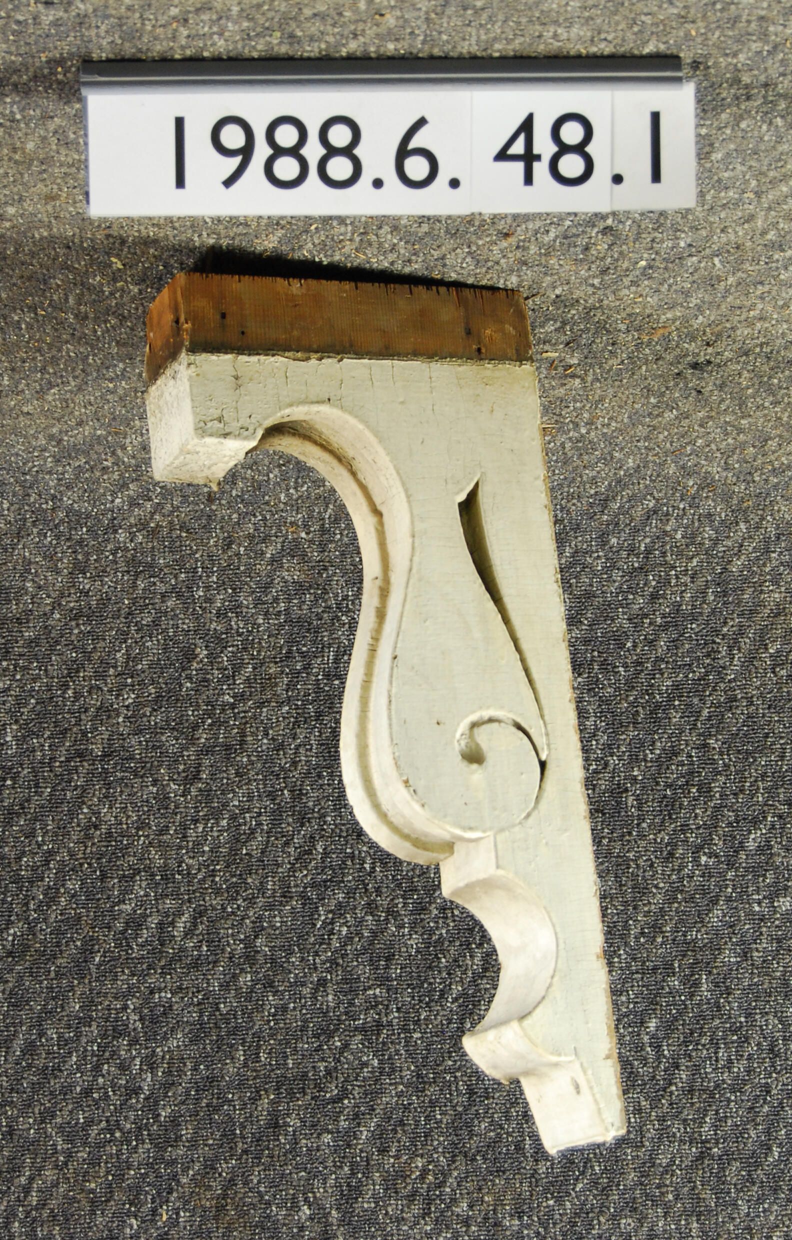 Wood bracket. Scrolled sides. Painted white. Inscriptions or Markings: Manufacturer: Place of Manufacturer: Design motif: Style: Finish: Painted