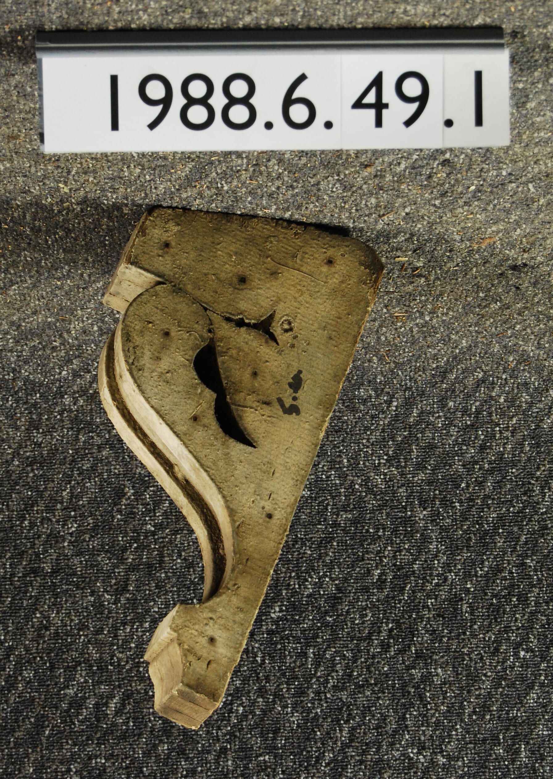Wood bracket. Scrolled sides. Angled top. Charred at top. Painted yellow. Inscriptions or Markings: Manufacturer: Place of Manufacturer: Design motif: Style: Finish: Painted