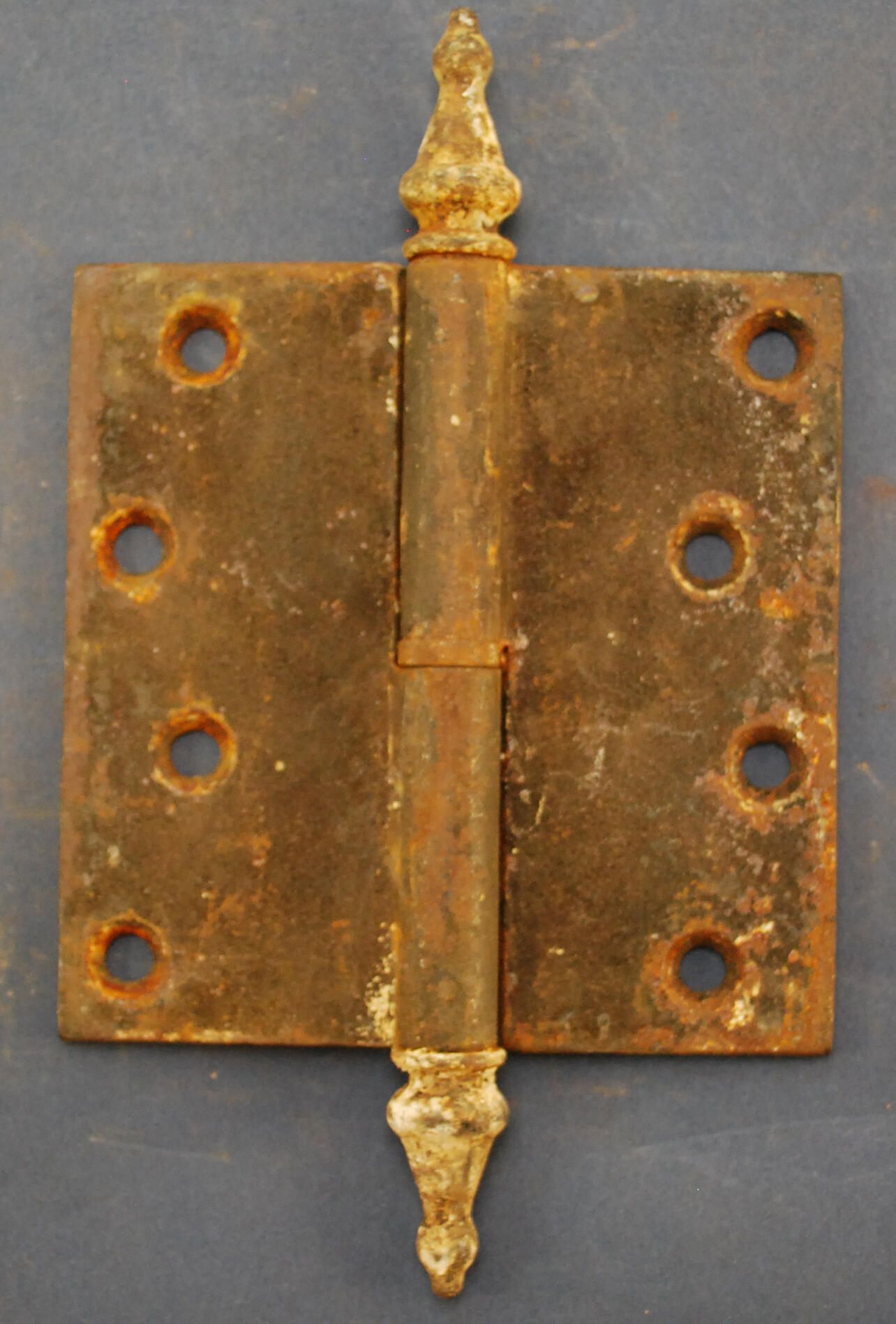 Design Name: Manufacturer: Unknown Style: Material: Iron Manufacturing Method: Cast Surface Finish: Japanned / Painted VDA Classification: VDA Number: Shape: Patent Specifics: Lock Type (If Applicable): Inscription/Makers Mark: Inscription Text: 4 x 4 Comments: Loose joint, steeple tipped, has been burned (subject to fire).