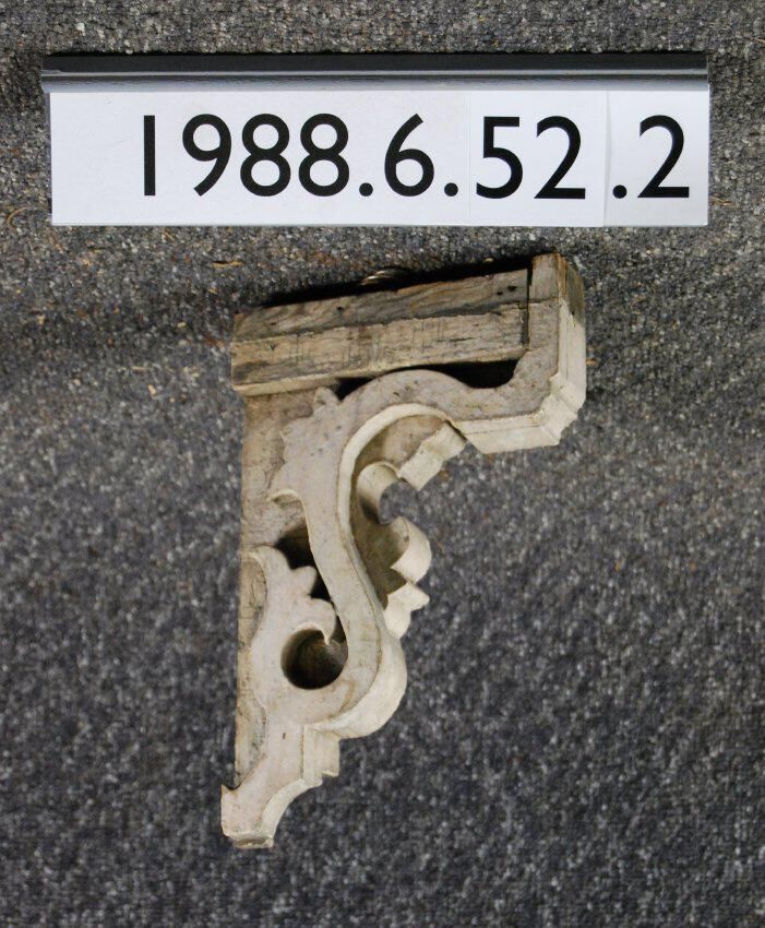 Wood bracket. Scrolled on one side only. Painted beige. Inscriptions or Markings: Manufacturer: Place of Manufacturer: Design motif: Style: Finish: Painted