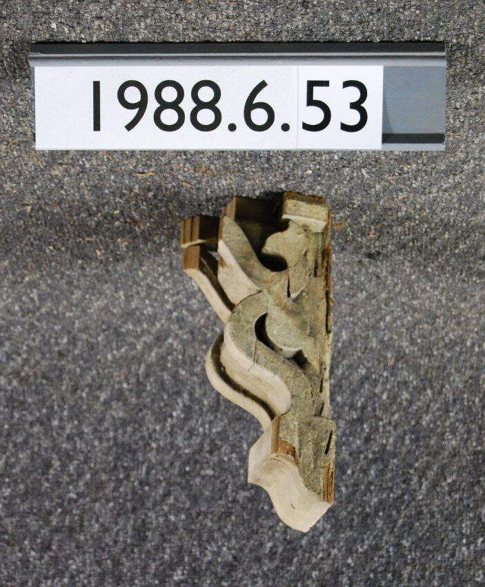 Wood bracket. Scrolled sides. Upper front is missing. Painted beige / yellow. Inscriptions or Markings: Manufacturer: Place of Manufacturer: Design motif: Style: Finish: Painted