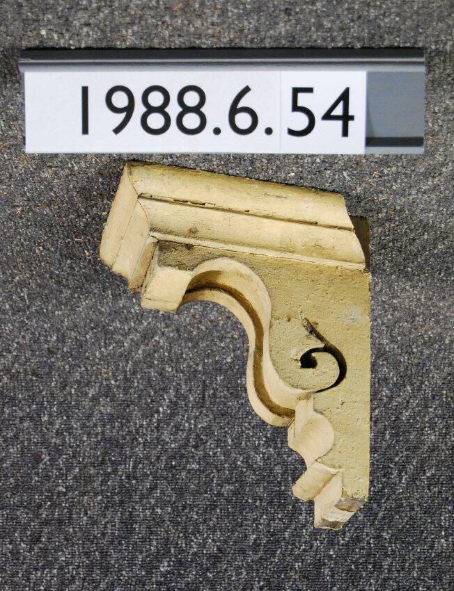 Wood bracket. Scrolled sides. Moldings at top. Painted yellow. Inscriptions or Markings: Manufacturer: Place of Manufacturer: Design motif: Style: Finish: Painted