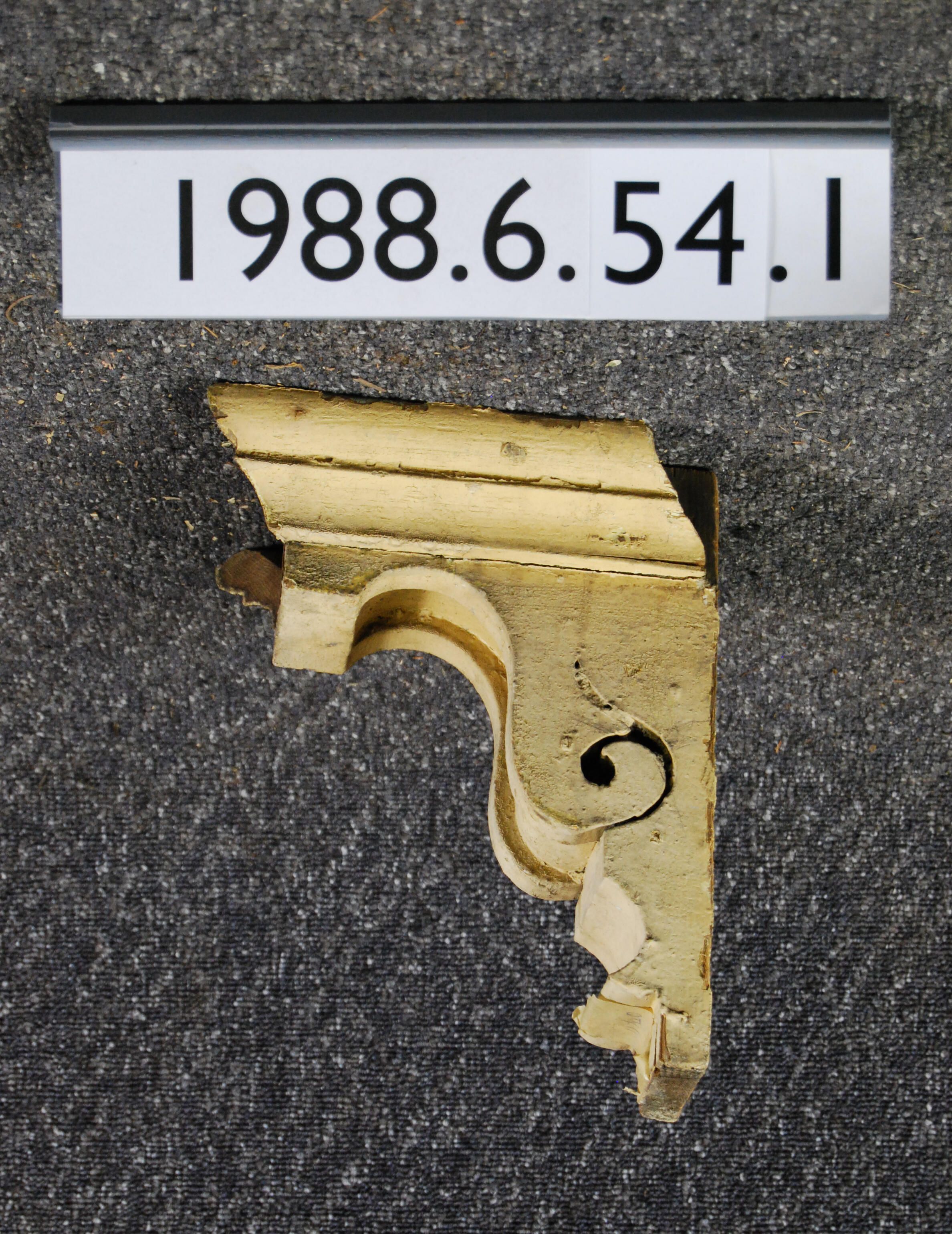 Wood bracket. Scrolled sides. Two moldings at top. (One detached). Painted yellow. Inscriptions or Markings: Manufacturer: Place of Manufacturer: Design motif: Style: Finish: Painted