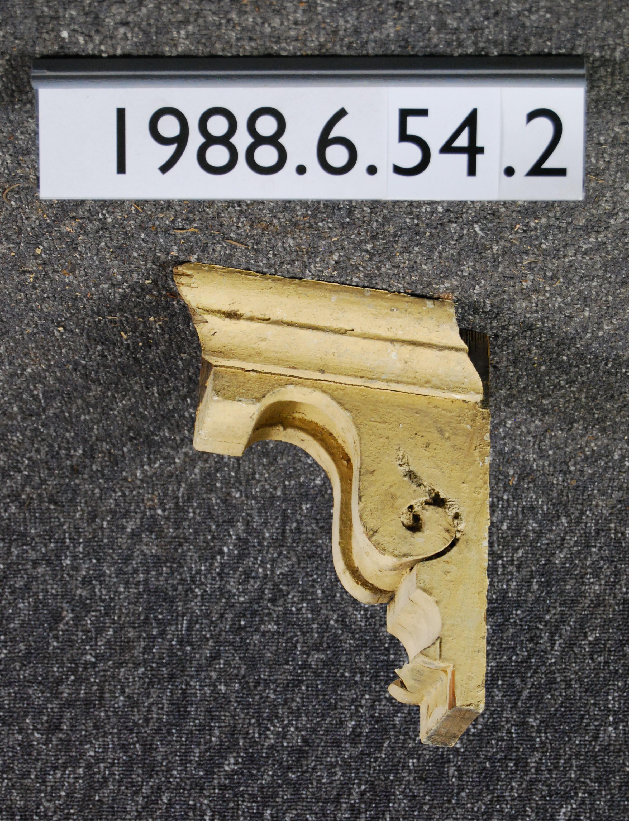 Wood bracket. Scrolled sides. One molding at top. Painted yellow. Inscriptions or Markings: Manufacturer: Place of Manufacturer: Design motif: Style: Finish: Painted