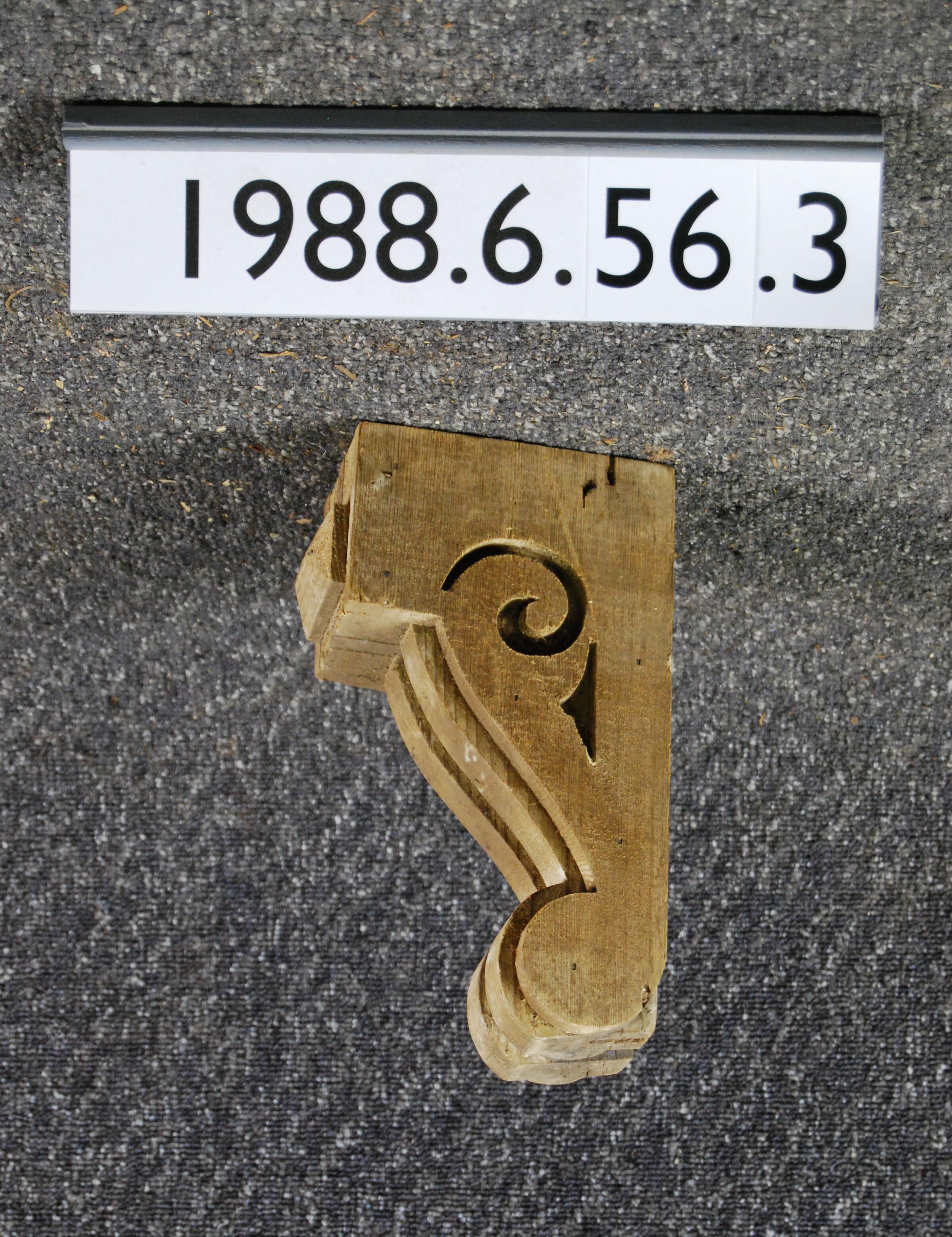 Wood bracket. Scrolled sides. Pyramidal block ornament at top front. Stripped of paint. Inscriptions or Markings: Manufacturer: Place of Manufacturer: Design motif: Style: Finish: Stripped