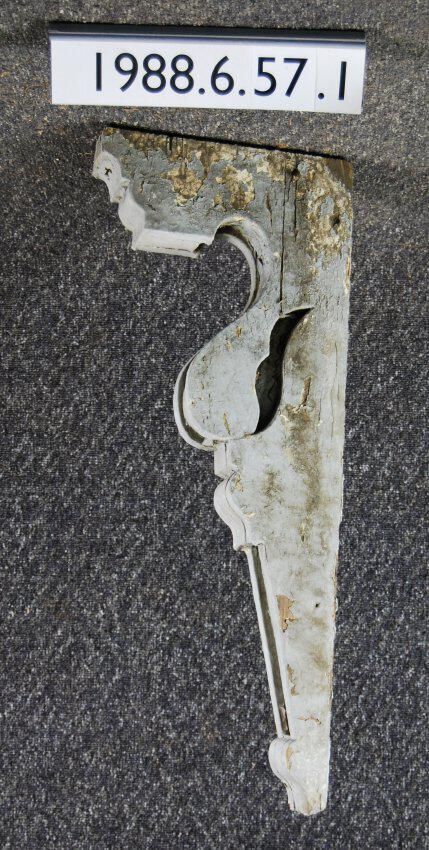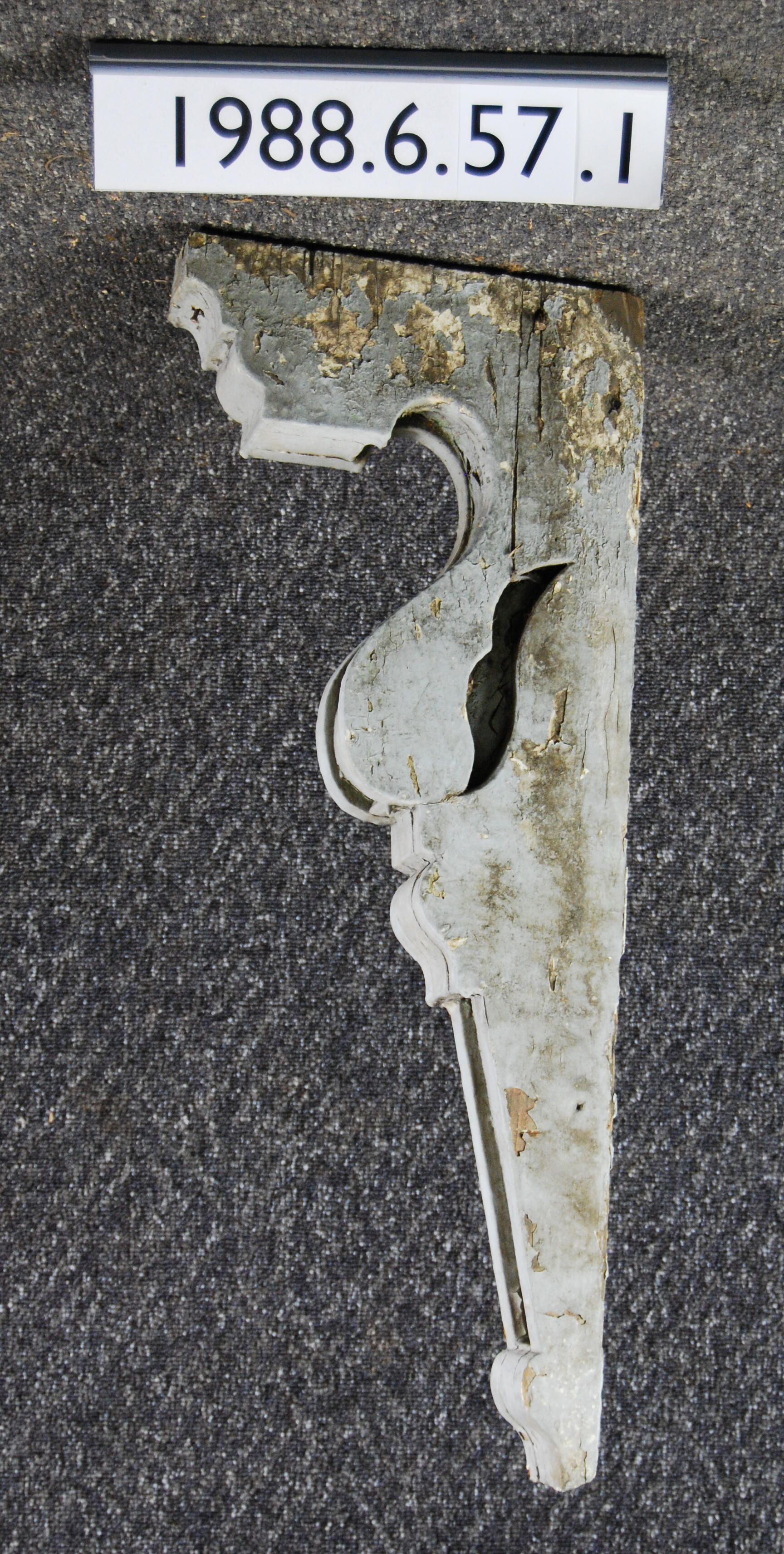 Wood bracket. Scrolled sides. Painted grey. Inscriptions or Markings: Manufacturer: Place of Manufacturer: Design motif: Style: Finish: Painted
