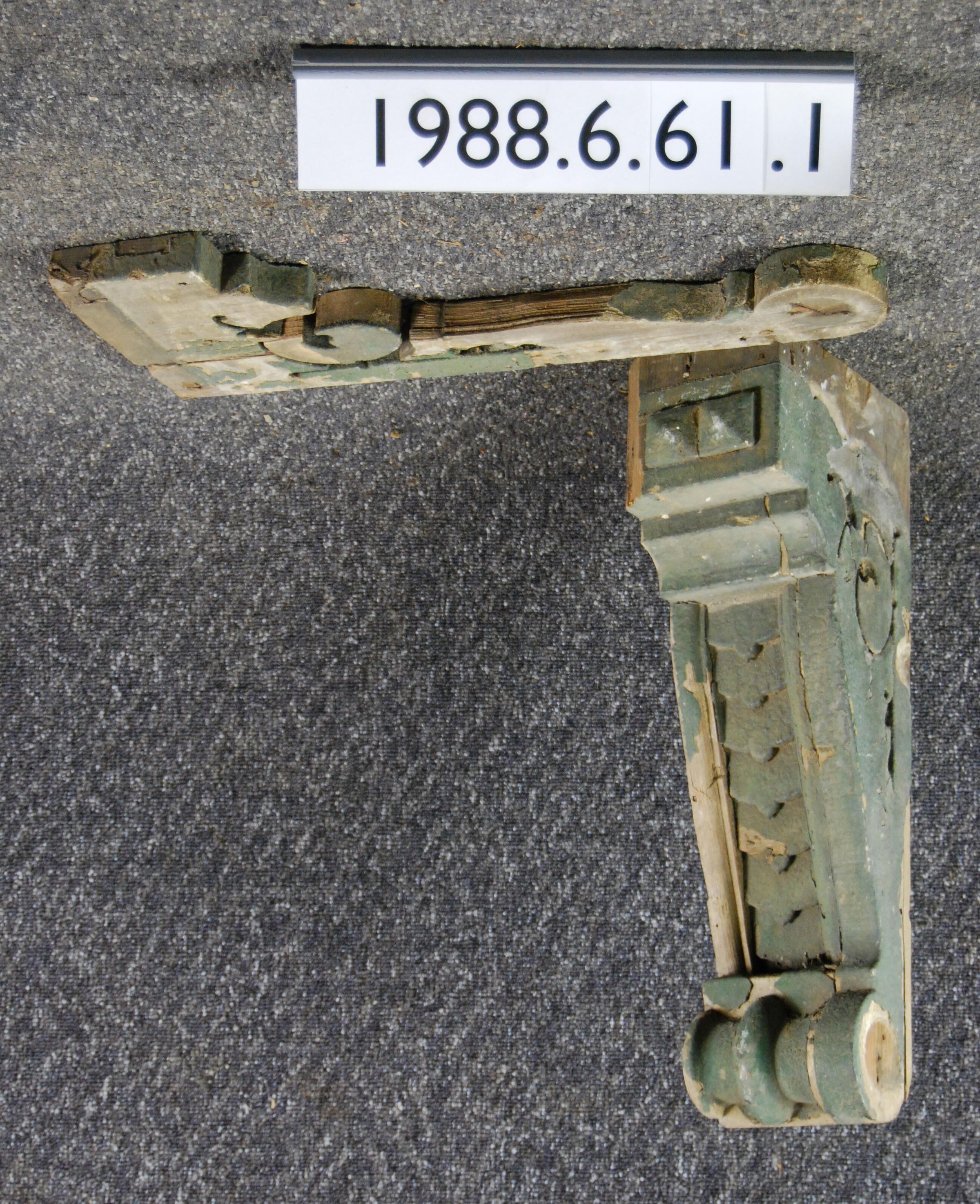 Wood bracket. Scrolled sides. Front has pyramidal block ornaments at top. Missing and detached parts. Front has scaled ornament. Painted green. Inscriptions or Markings: Manufacturer: Place of Manufacturer: Design motif: Style: Finish: Painted
