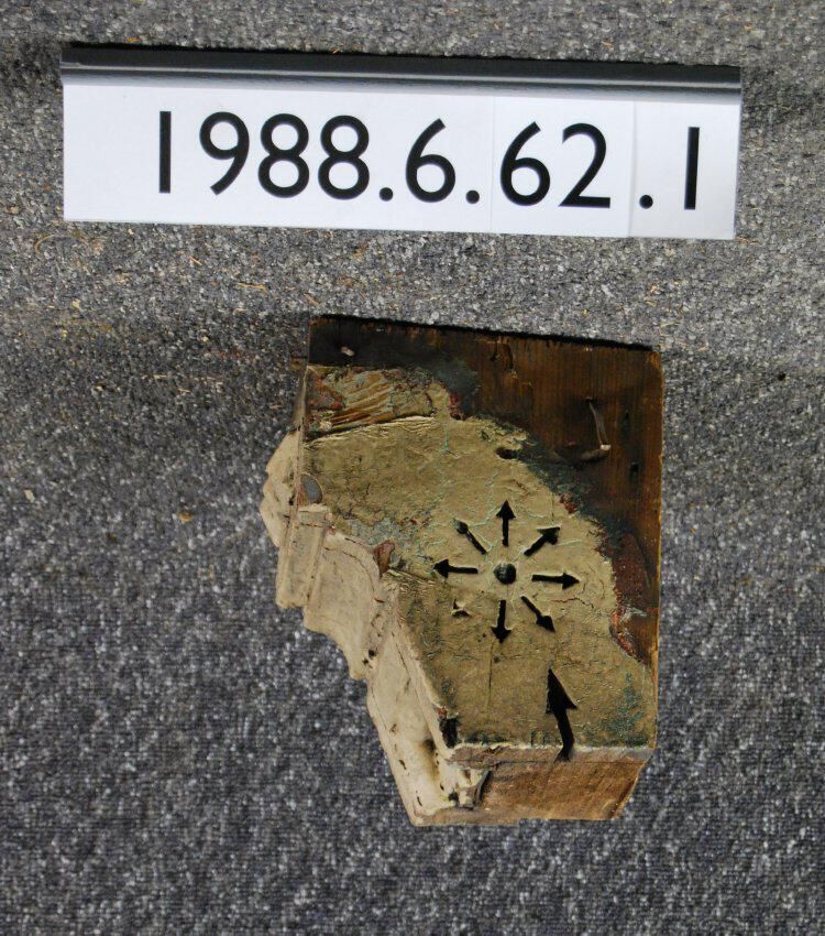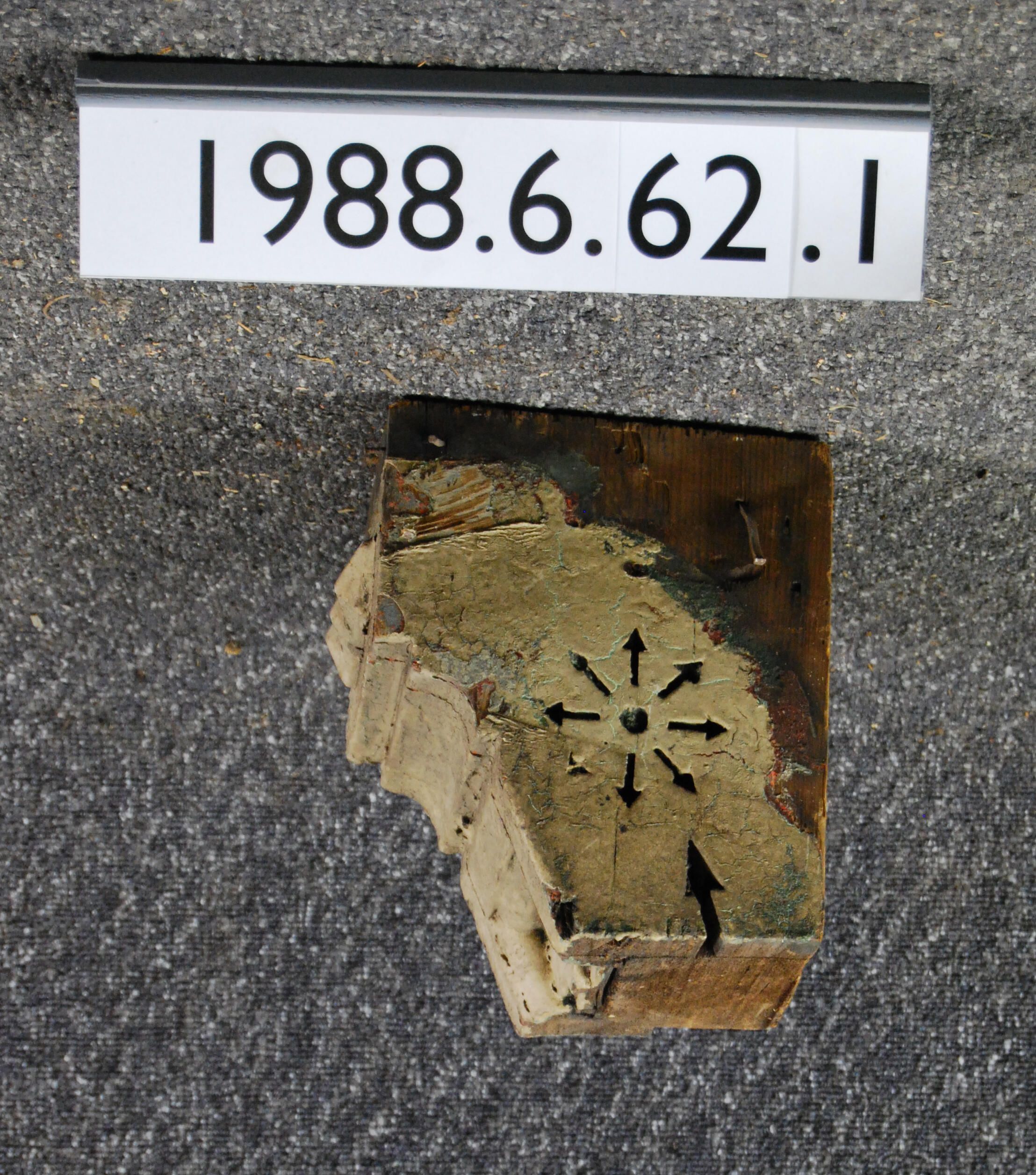 Wood bracket. Sides have pierced arrow decoration. Front has pyramidal block ornamentation and scaled ornament.Lower end is truncated. Painted green and beige.