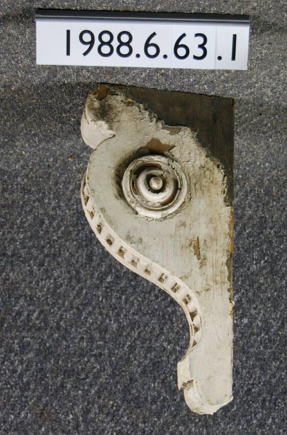 Wood bracket. Bullseye ornament on each side. Series of horizontal ribs on front. Painted pinkish beige. Inscriptions or Markings: Manufacturer: Place of Manufacturer: Design motif: Style: Finish: Painted