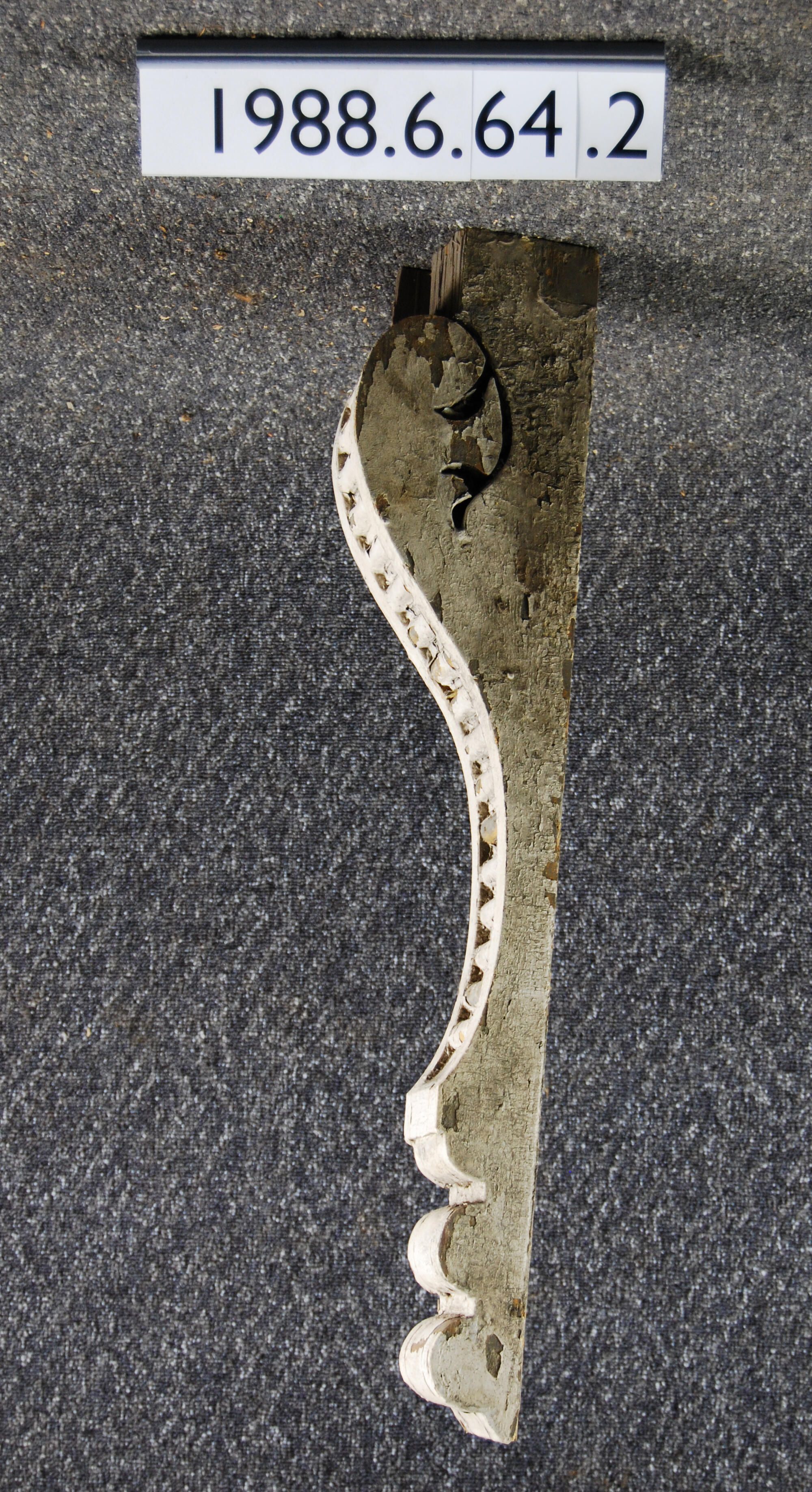 Wood bracket. Scrolled sides. Front has horizontal ribbing ornament. Loose piece on side. Painted pinkish beige. Inscriptions or Markings: Manufacturer: Place of Manufacturer: Design motif: Style: Finish: Painted