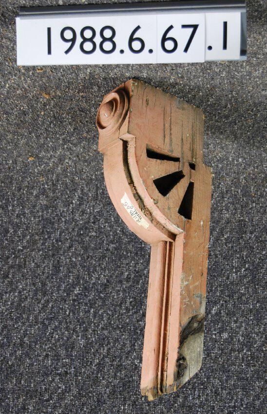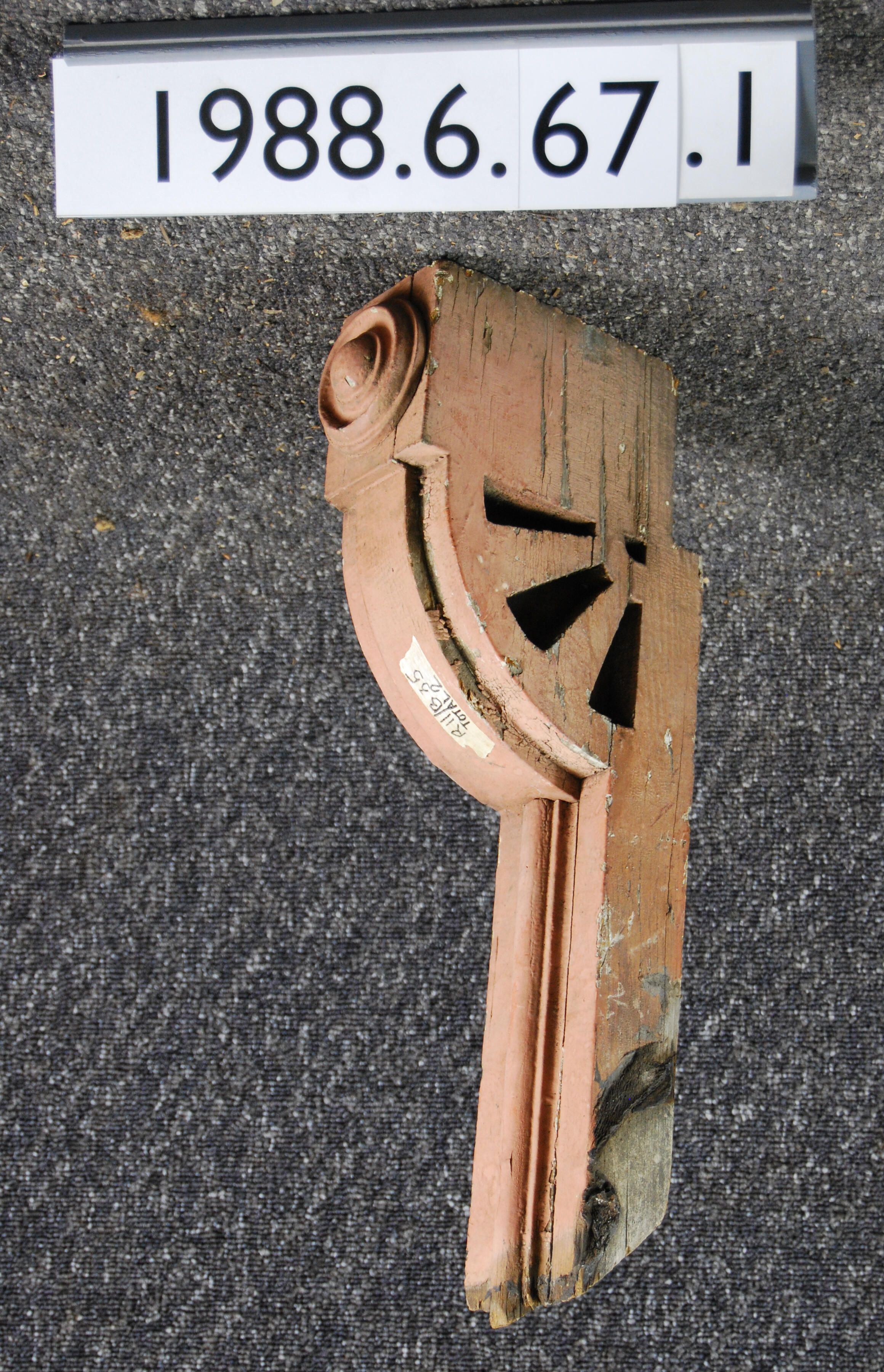 Wood bracket. Quarter sunburst on upper sides. Front has bulls eye ornament on top. Astragal moulding on lower front. Lower end has angular cut. Inscriptions or Markings: Manufacturer: Place of Manufacturer: Design motif: Style: Finish: Painted