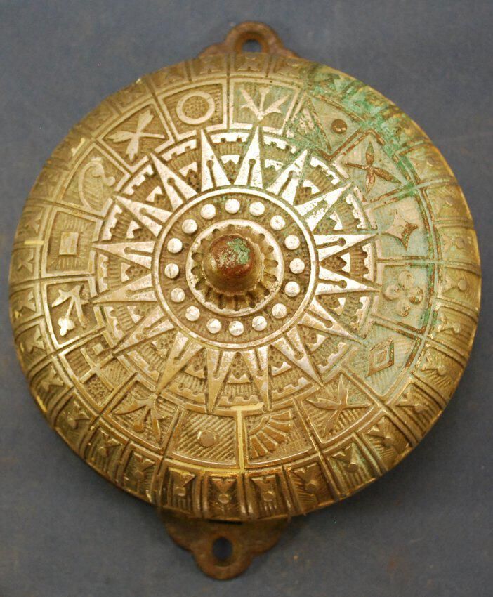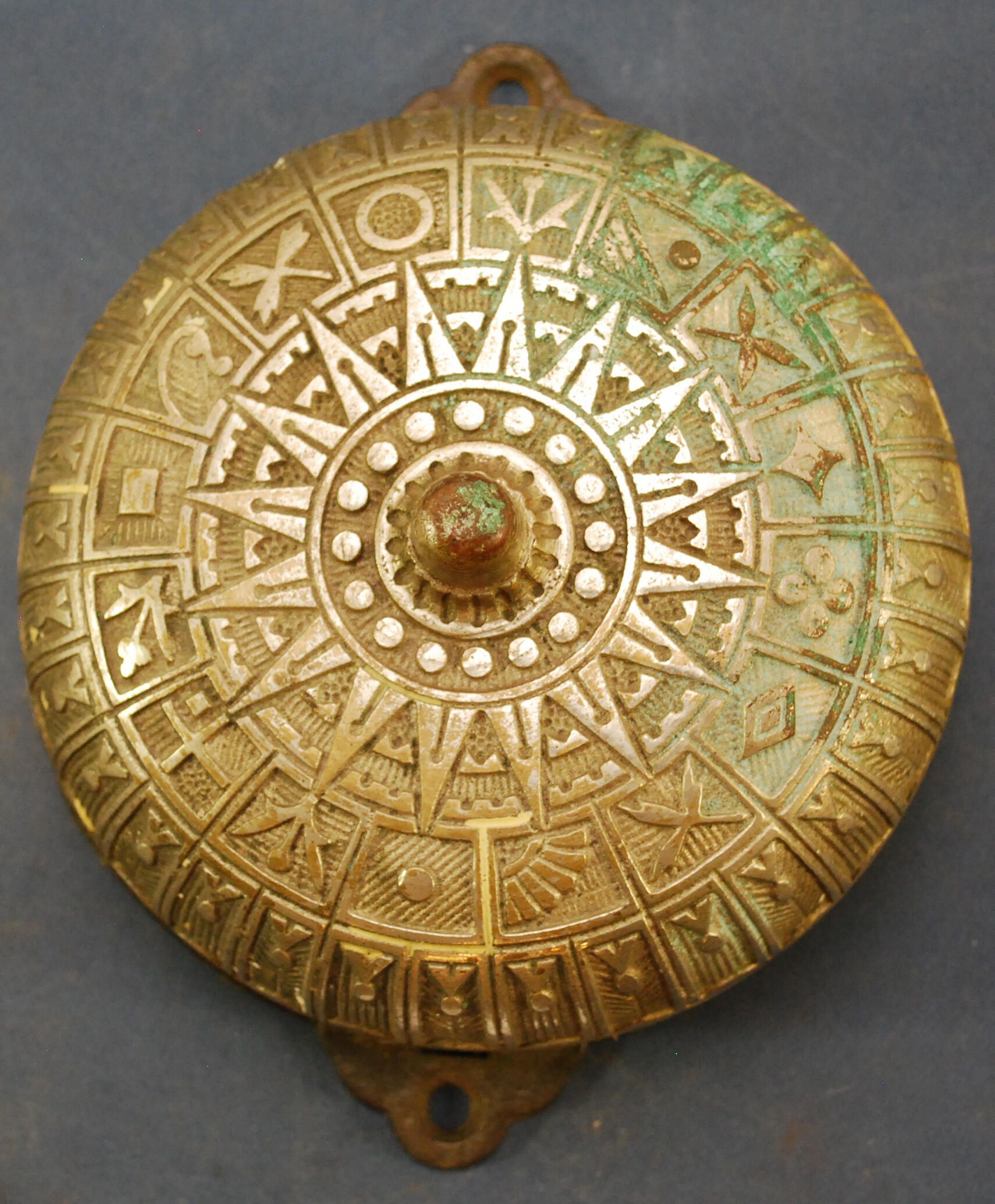 Design Name: Manufacturer: Unknown Style: Eastlake Material: Iron / Brass Manufacturing Method: Cast Surface Finish: Plated, Nickel VDA Classification: VDA Number: Shape: Patent Specifics: July 2, 1872 / April 13, 1873 / July 4, 1876 Lock Type (If Applicable): Inscription/Makers Mark: Inscription Text: Comments: Active oxidation on bell.