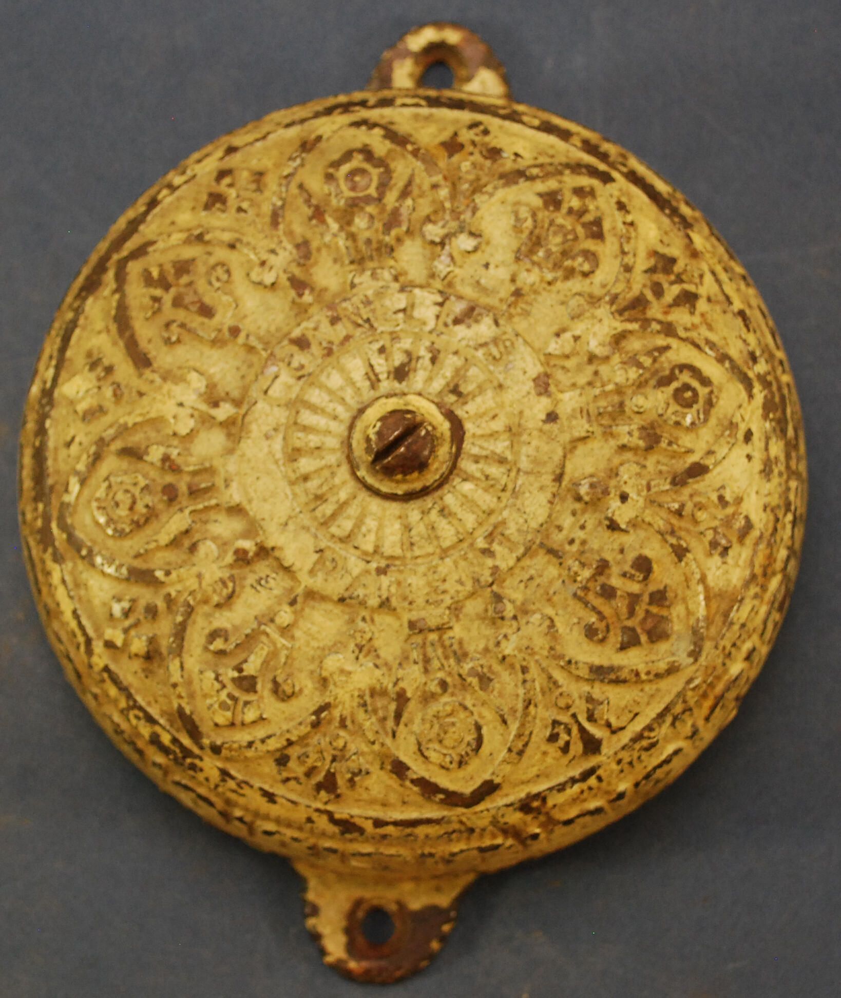 Design Name: Manufacturer: Unknown Style: Eastlake Material: Iron Manufacturing Method: Cast Surface Finish: Plated VDA Classification: VDA Number: Shape: Patent Specifics: "PAT APRIL 28th 1874" Lock Type (If Applicable): Inscription/Makers Mark: Inscription Text: Comments: Lever activated, later paint.