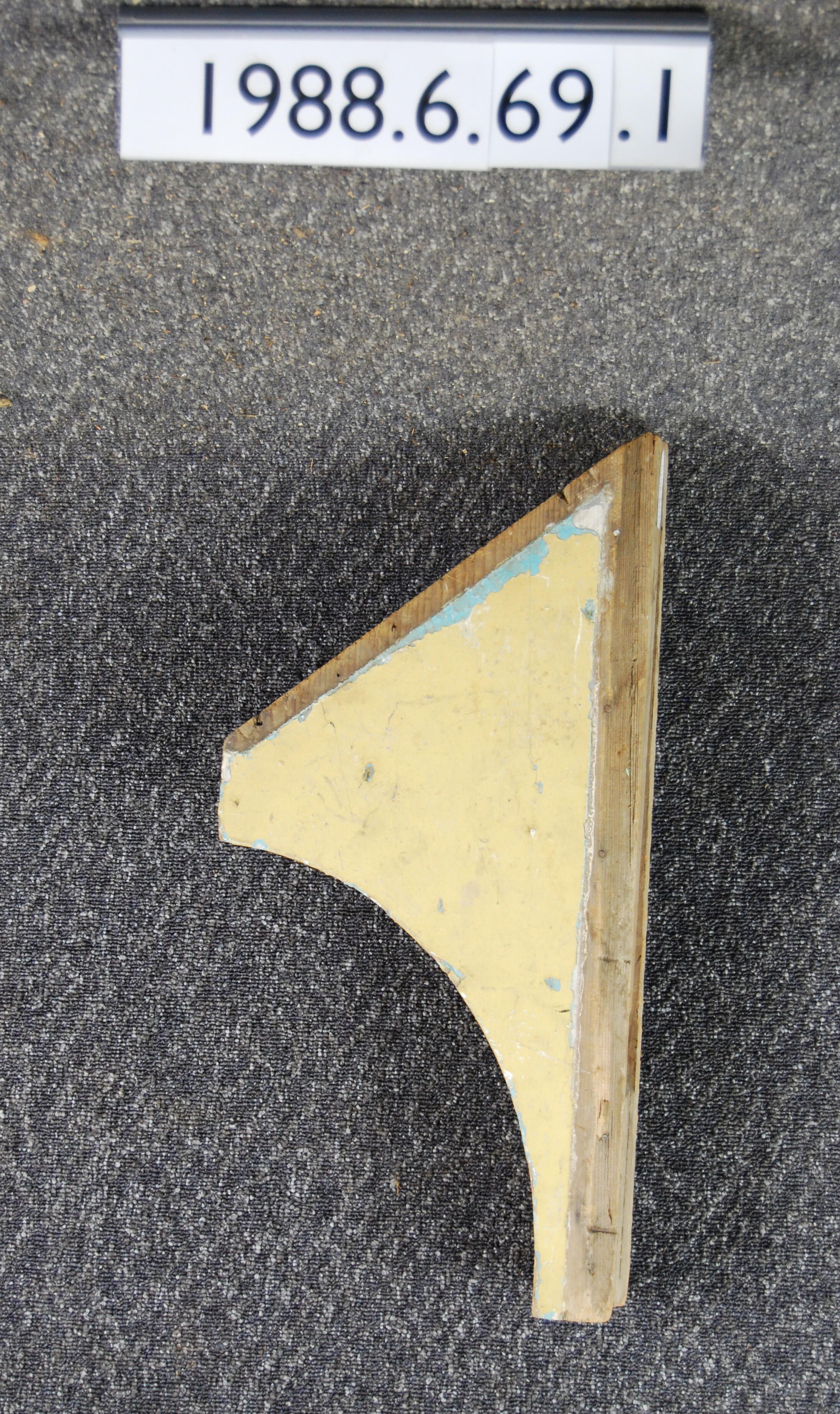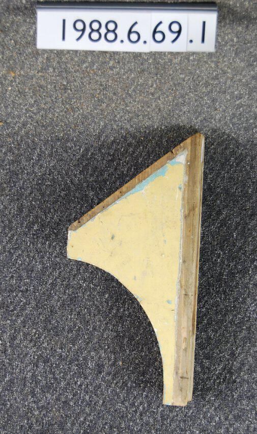 Wood cornice bracket. Top cut at an angle. Front has recessed curve. Painted yellow over multiple colored layers. Chunk missing from side. Inscriptions or Markings: Manufacturer: Place of Manufacturer: Design motif: Style: Finish: Painted