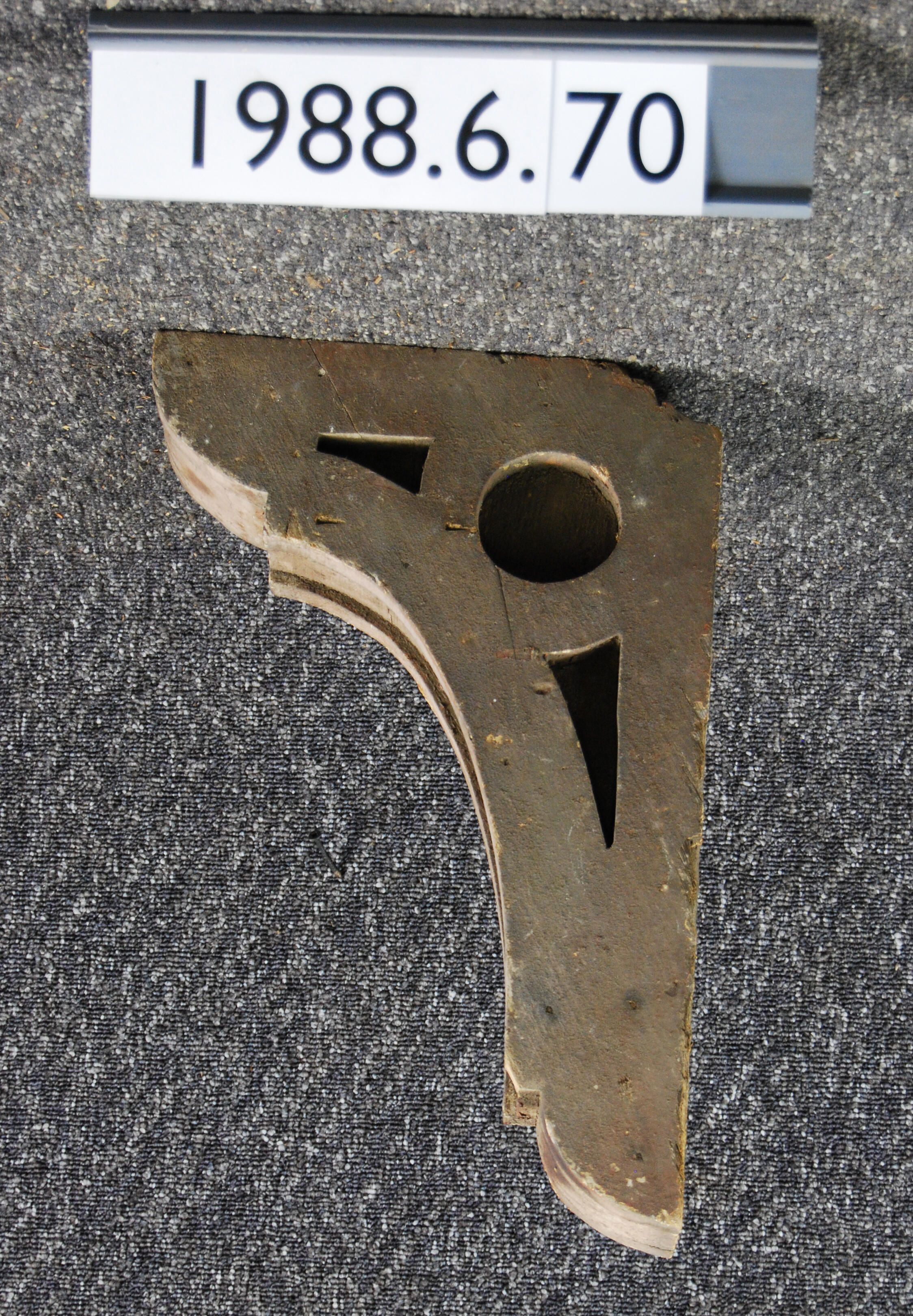 Wood bracket. Side has circular cut-out and quasi-triangular cut-outs. Front has recess. Painted reddish-brown. Inscriptions or Markings: Manufacturer: Place of Manufacturer: Design motif: Style: Finish: Painted