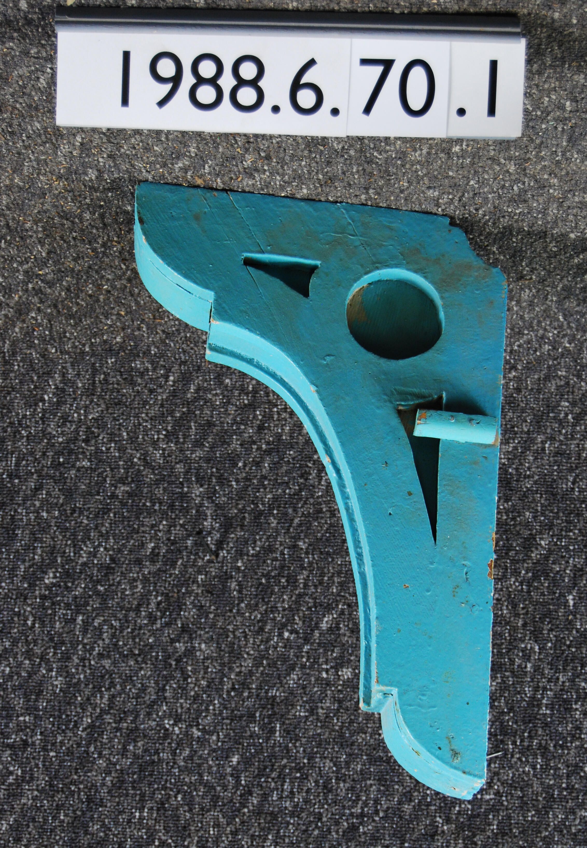 Wood bracket. Side has circular cut-out and quasi-triangular cut-outs. Front has recess. Painted light blue. Inscriptions or Markings: Manufacturer: Place of Manufacturer: Design motif: Style: Finish: Painted
