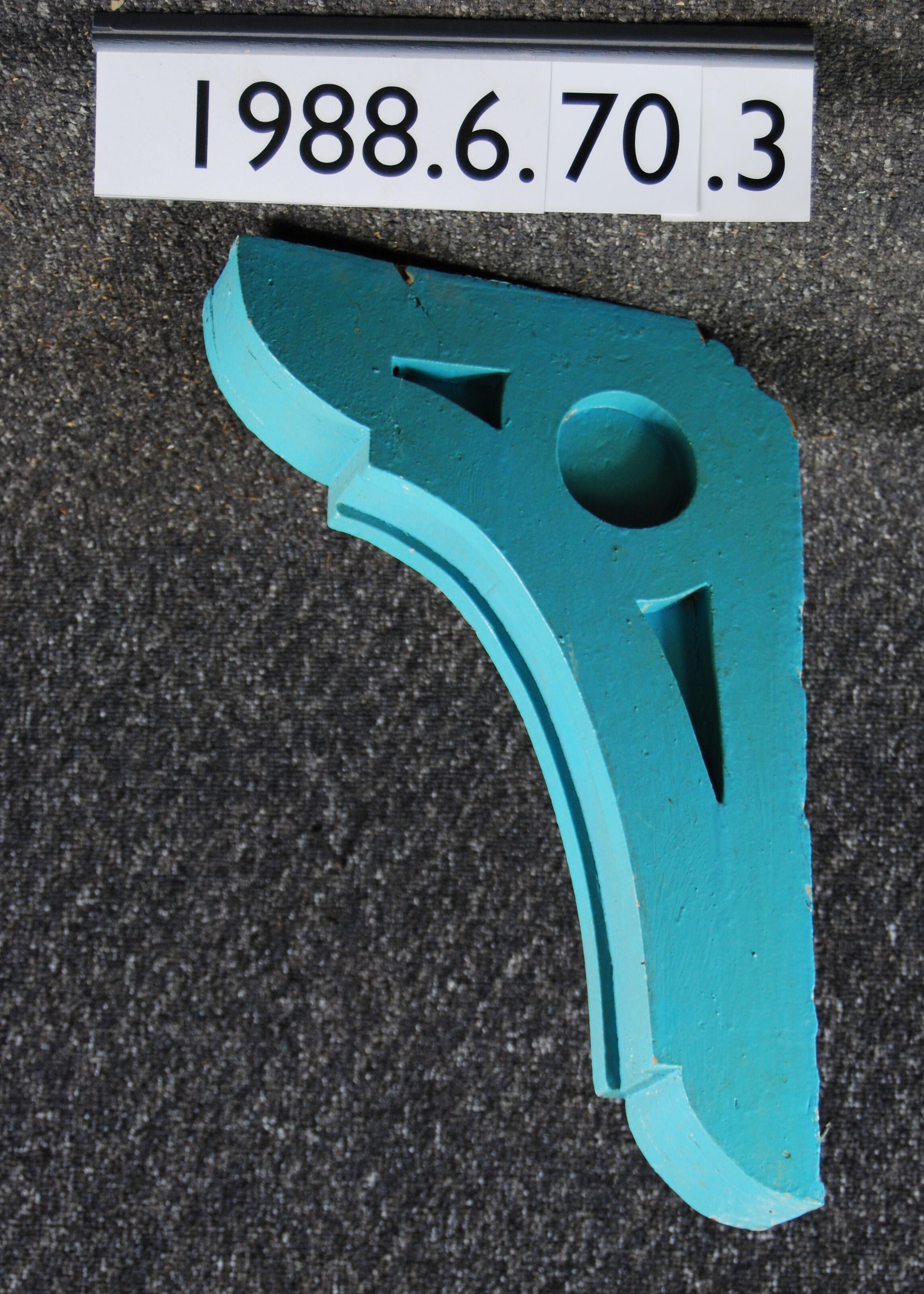 Wood bracket. Side has circular cut-out and quasi-triangular cut-outs. Front has recess. Painted light blue. Inscriptions or Markings: Manufacturer: Place of Manufacturer: Design motif: Style: Finish: Painted