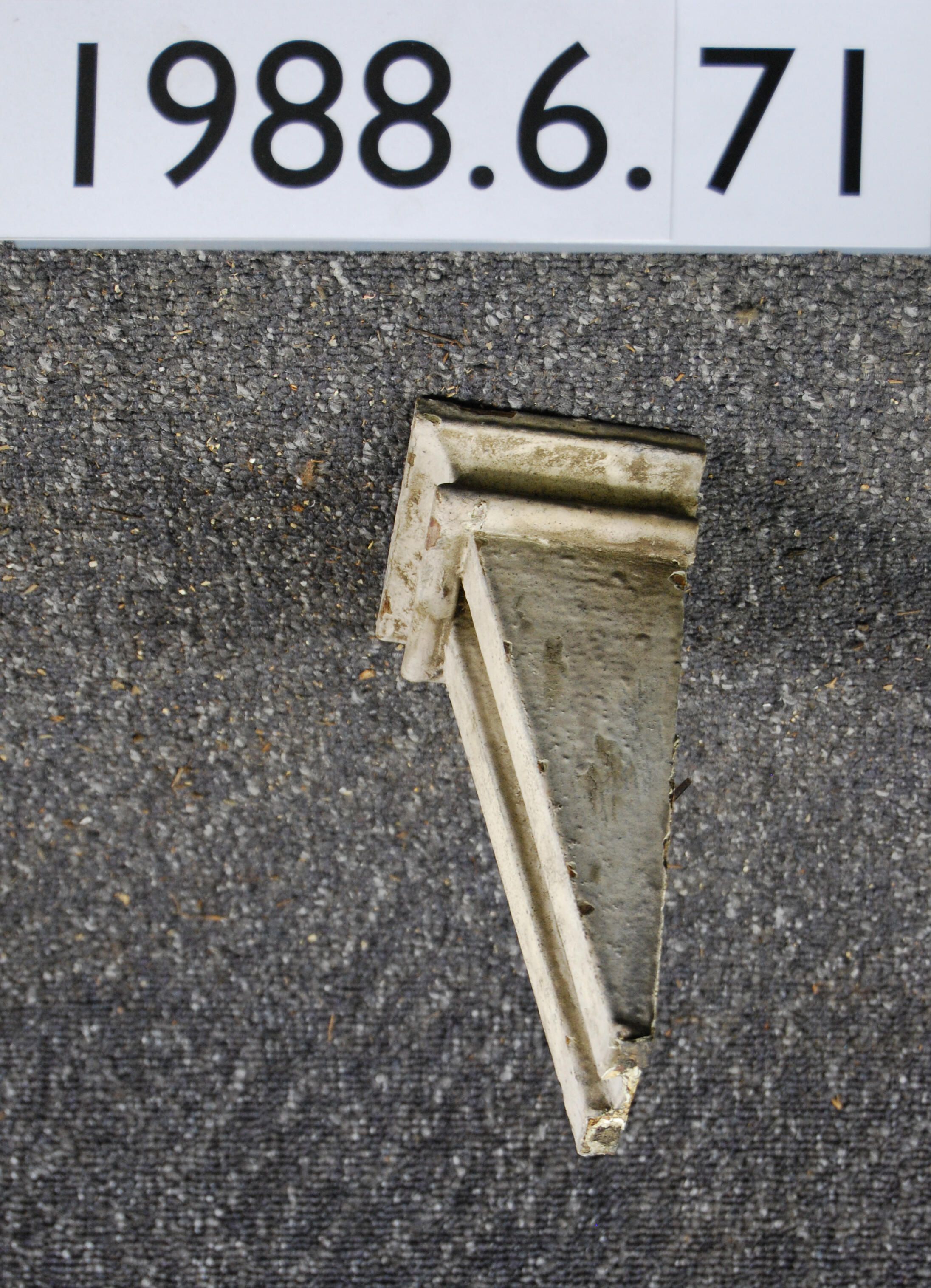 Wood bracket. Moldings around top end. Angular sides. Fluted recess at front. Painted beige. Inscriptions or Markings: Manufacturer: Place of Manufacturer: Design motif: Style: Finish: Painted
