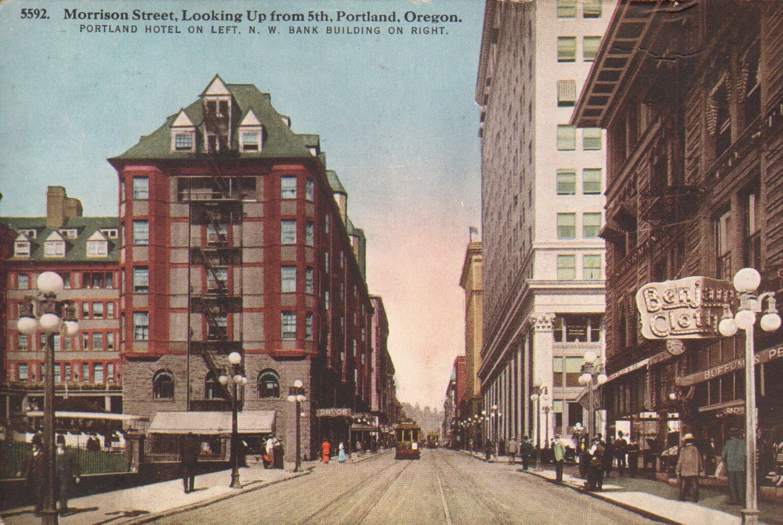 Building/location:Morrison Street, looking up from 5th St. Subject Matter:Street Image process:Lithograph Architect: Building Description: List of Drawings in set: