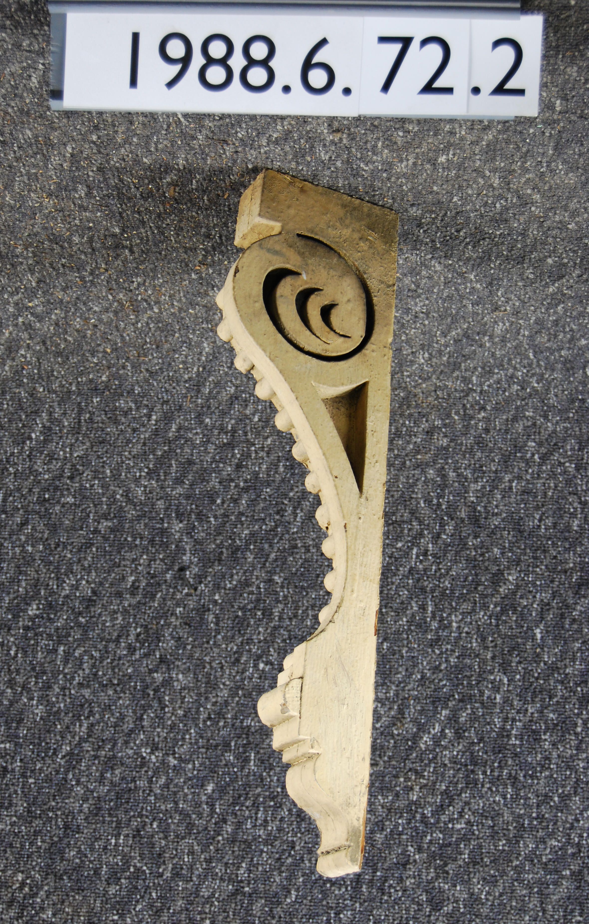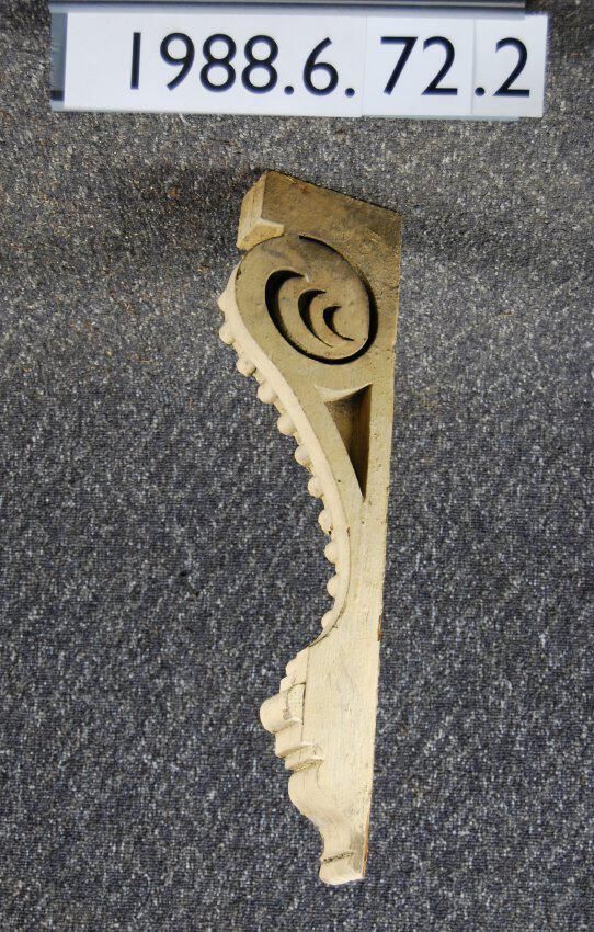 Wood bracket. Scrolled sides. Ribbed ornament on front. Painted beige. Inscriptions or Markings: Manufacturer: Place of Manufacturer: Design motif: Style: Finish: Painted