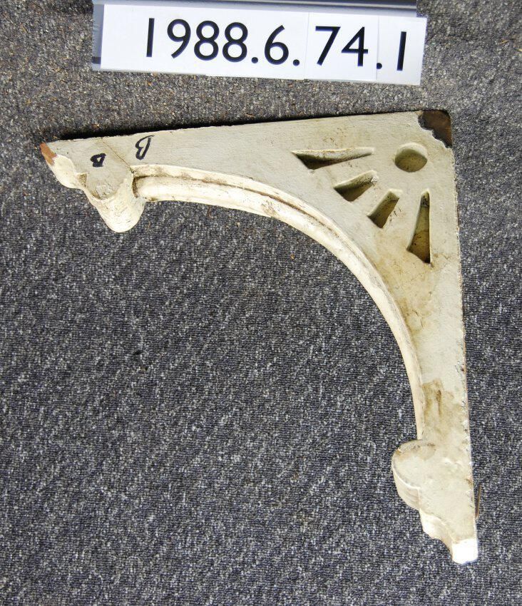 Wood bracket. Sides have sunburst ornament. Front has curved convex molding. Painted cream-white. Inscriptions or Markings: Manufacturer: Place of Manufacturer: Design motif: Style: Finish: Painted