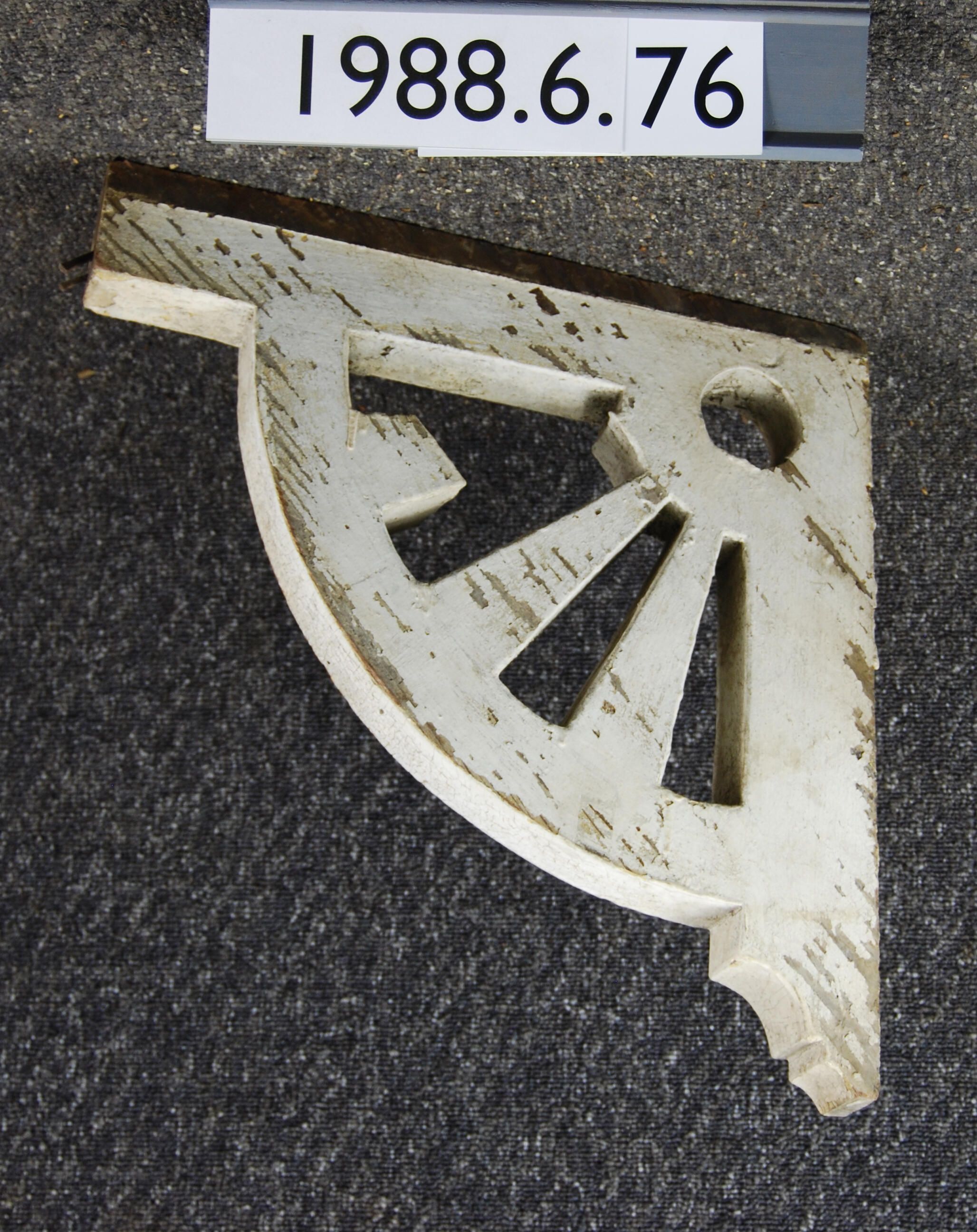 Wood bracket. Sides have sunburst ornament. Missing piece. Painted cream-white. Inscriptions or Markings: Manufacturer: Place of Manufacturer: Design motif: Style: Finish: Painted