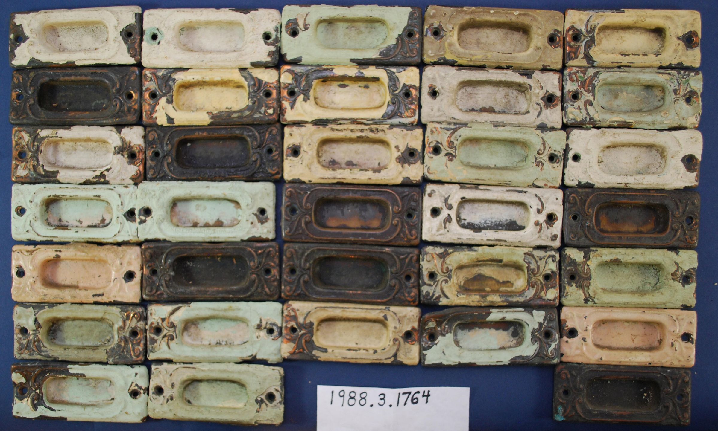 Design Name: Manufacturer: Unknown Style: Material: Brass Manufacturing Method: Wrought / Stamped Surface Finish: Plated, Copper VDA Classification: VDA Number: Shape: Patent Specifics: Lock Type (If Applicable): Inscription/Makers Mark: Inscription Text: Comments: Flush lift, some are bent, some are painted, some with original finish.