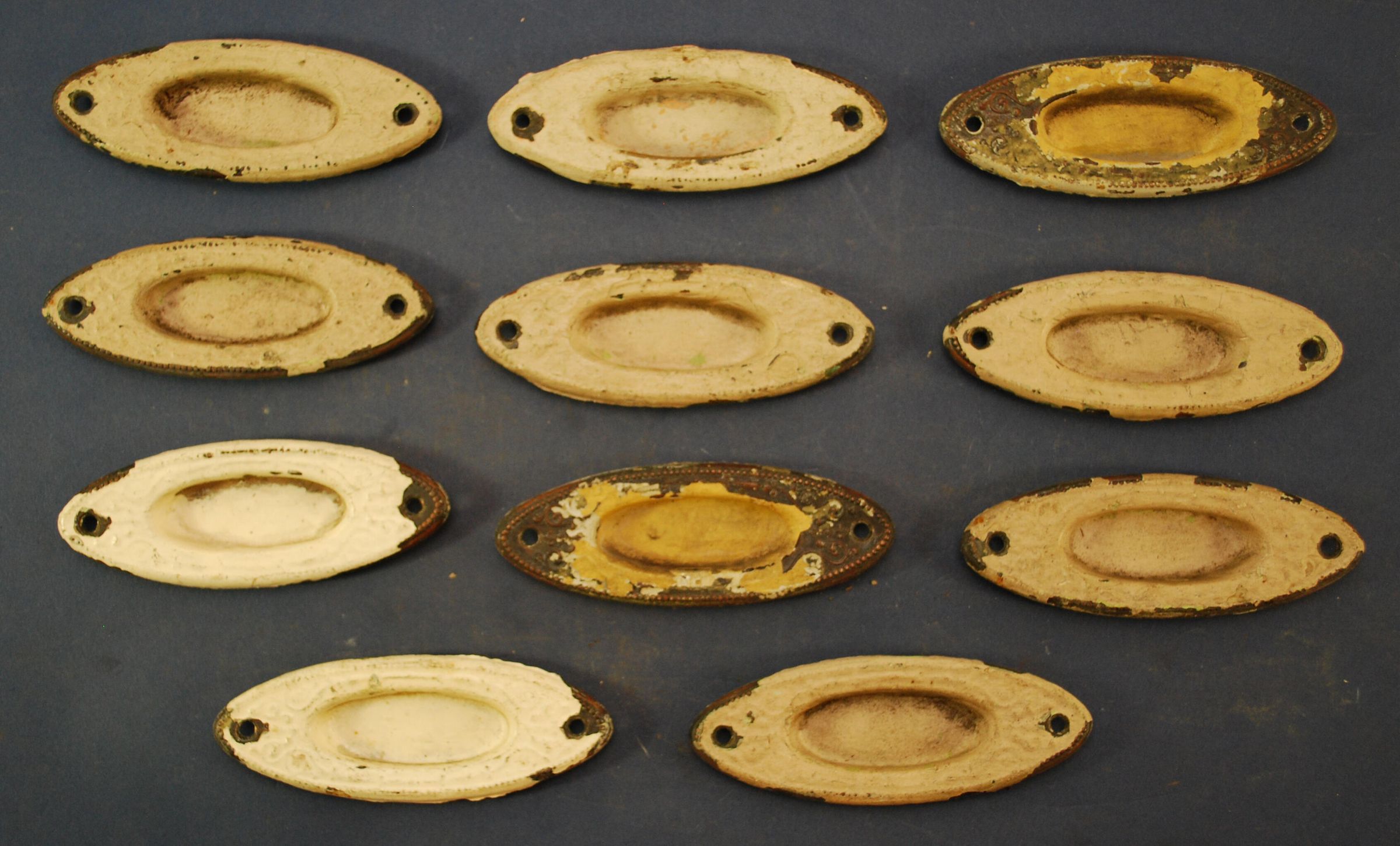 Design Name: Manufacturer: Unknown Style: Material: Brass Manufacturing Method: Wrought / Stamped Surface Finish: VDA Classification: VDA Number: Shape: Patent Specifics: Lock Type (If Applicable): Inscription/Makers Mark: Inscription Text: Comments: Flush lift, oval, all later painted.