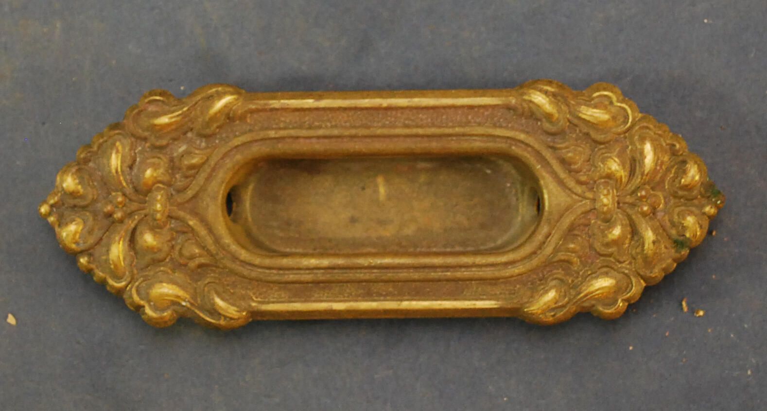 Design Name: Manufacturer: Unknown Style: Material: Brass Manufacturing Method: Wrought / Stamped Surface Finish: Aged / Unpolished VDA Classification: VDA Number: Shape: Patent Specifics: Lock Type (If Applicable): Inscription/Makers Mark: Inscription Text: Comments: Flush lift.