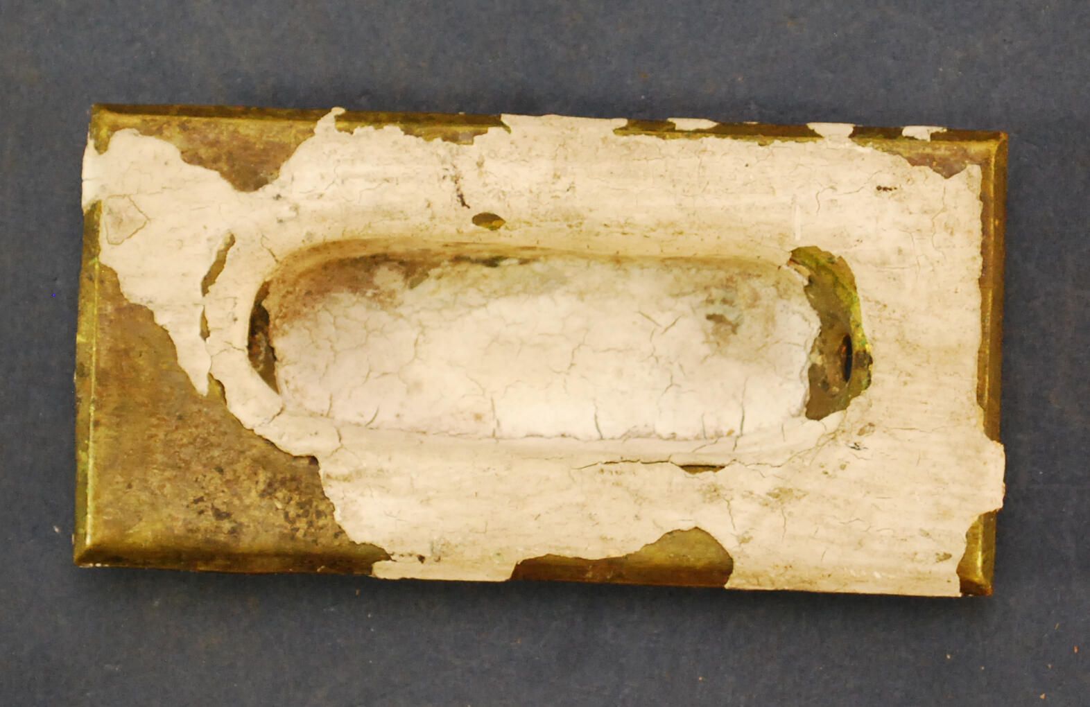 Design Name: Manufacturer: Unknown Style: Material: Brass Manufacturing Method: Wrought / Stamped Surface Finish: Aged / Unpolished / Painted VDA Classification: VDA Number: Shape: Patent Specifics: Lock Type (If Applicable): Inscription/Makers Mark: Inscription Text: Comments: Flush lift, later painted, slightly bent.