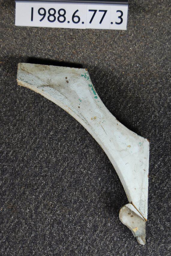 Wood bracket. Curved sides. Beaded / fluted front. Broken piece. Painted light blue and brown. Inscriptions or Markings: Manufacturer: Place of Manufacturer: Design motif: Style: Finish: Painted