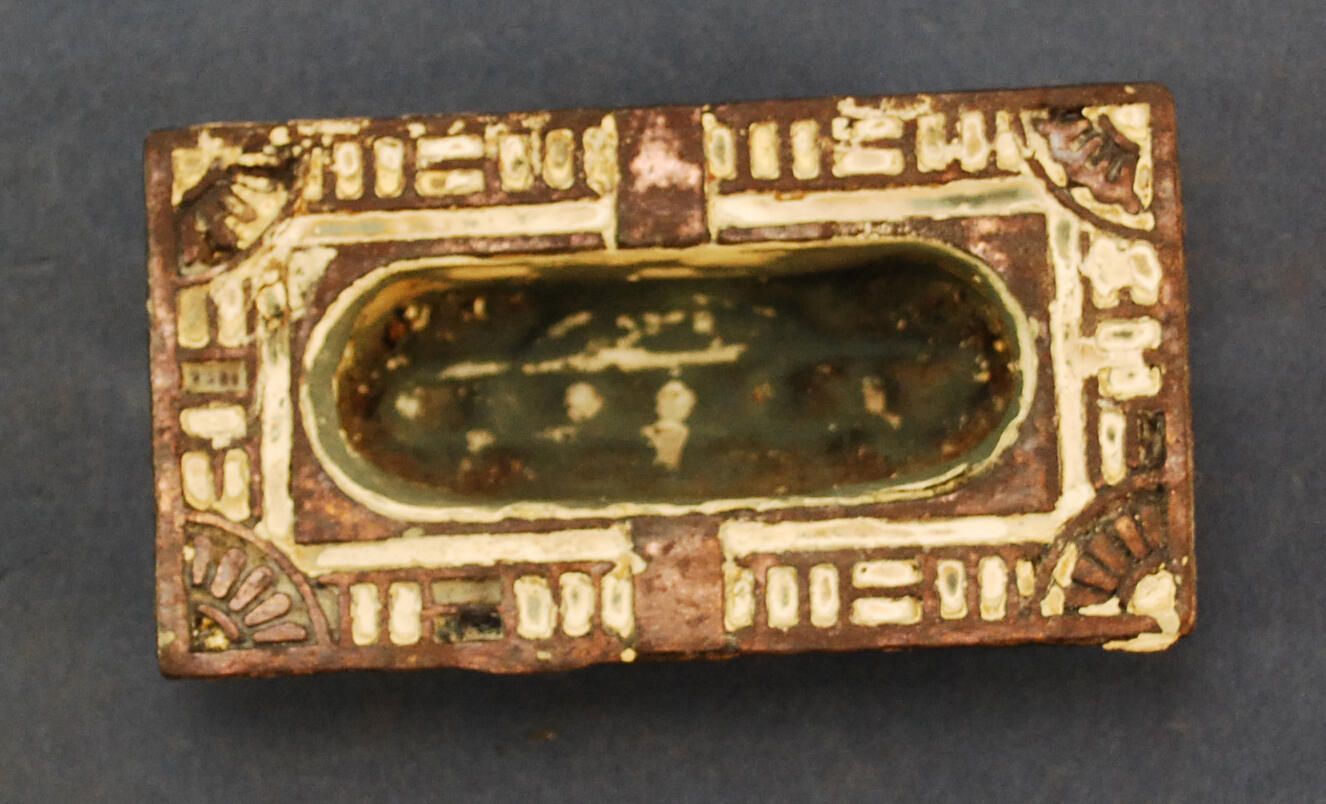 Design Name: Manufacturer: Unknown Style: Aesthetic Material: Iron Manufacturing Method: Cast Surface Finish: Plated, Copper VDA Classification: VDA Number: Shape: Patent Specifics: Lock Type (If Applicable): Inscription/Makers Mark: Inscription Text: Comments: Flush lift, 1988.3.1773 similar design.