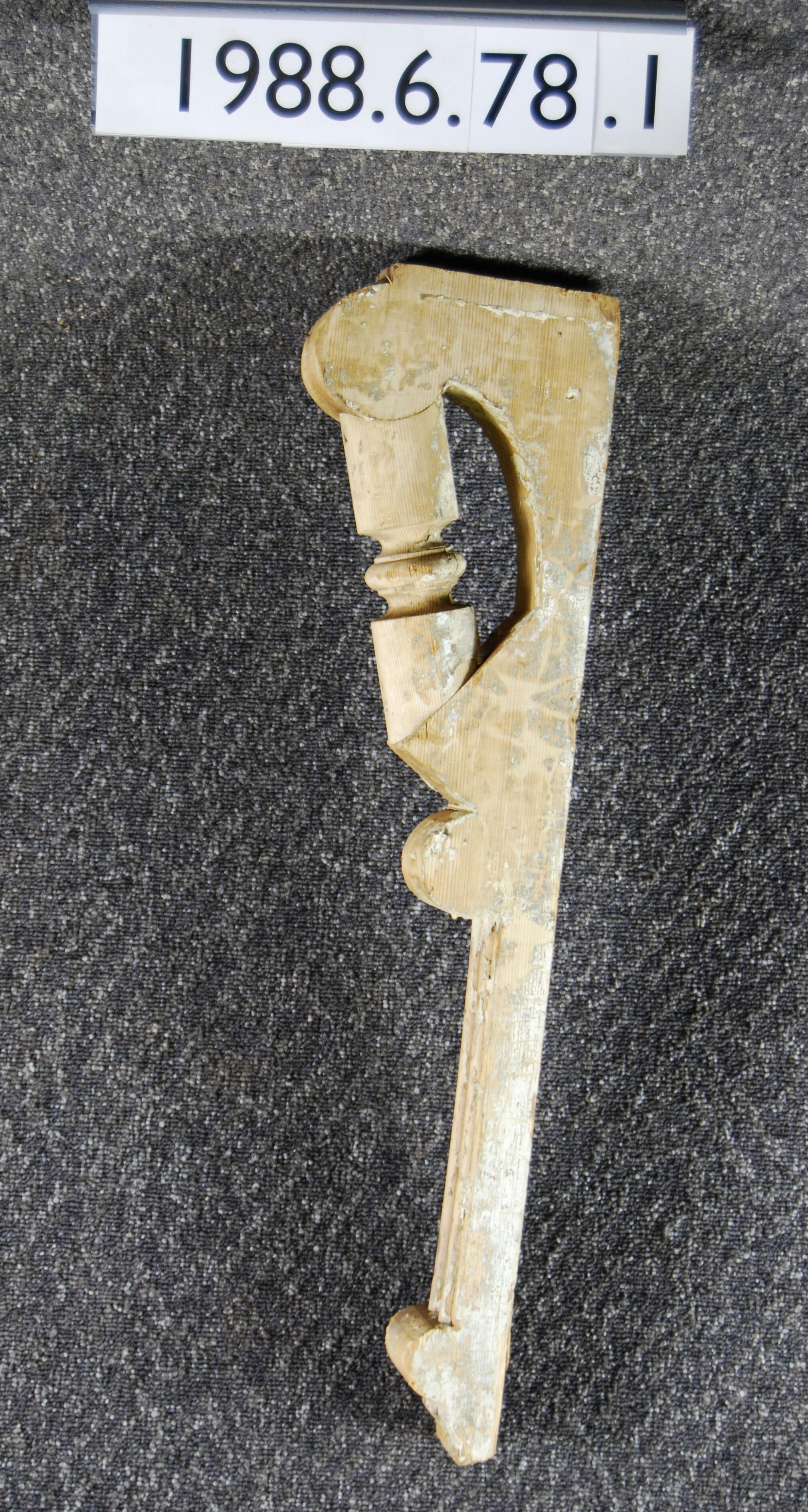 Wood bracket. Single turned spindle near top. Convex moldings applied to lower front. Remnants of paint. Partially stripped. Inscriptions or Markings: Manufacturer: Place of Manufacturer: Design motif: Style: Finish: Painted