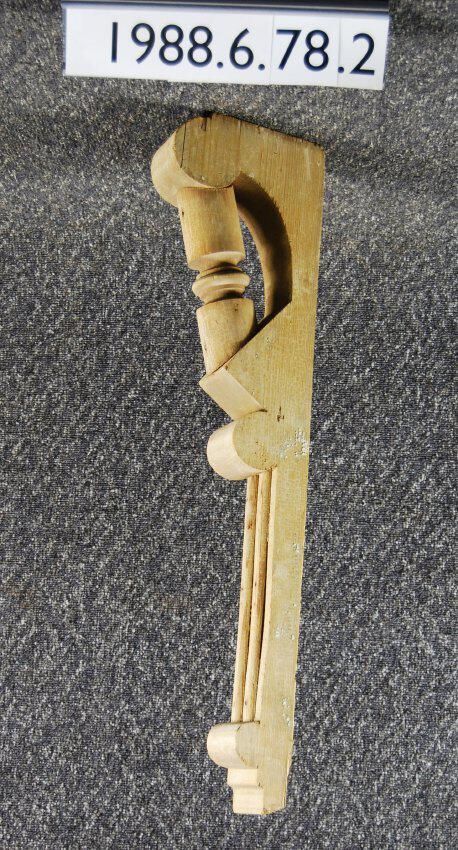 Wood bracket. Single turned spindle near top. Convex moldings applied to lower front. Remnants of paint. Partially stripped. Inscriptions or Markings: Manufacturer: Place of Manufacturer: Design motif: Style: Finish: Painted