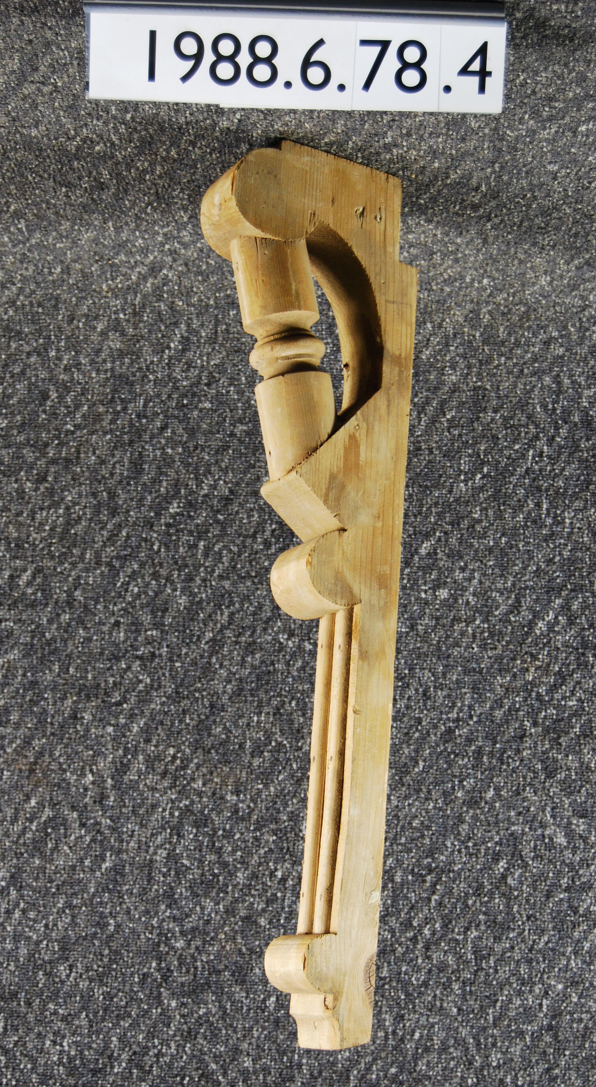 Wood bracket. Single turned spindle near top. Convex moldings applied to lower front. Remnants of paint. Partially stripped. Inscriptions or Markings: Manufacturer: Place of Manufacturer: Design motif: Style: Finish: Painted / Partially Stripped