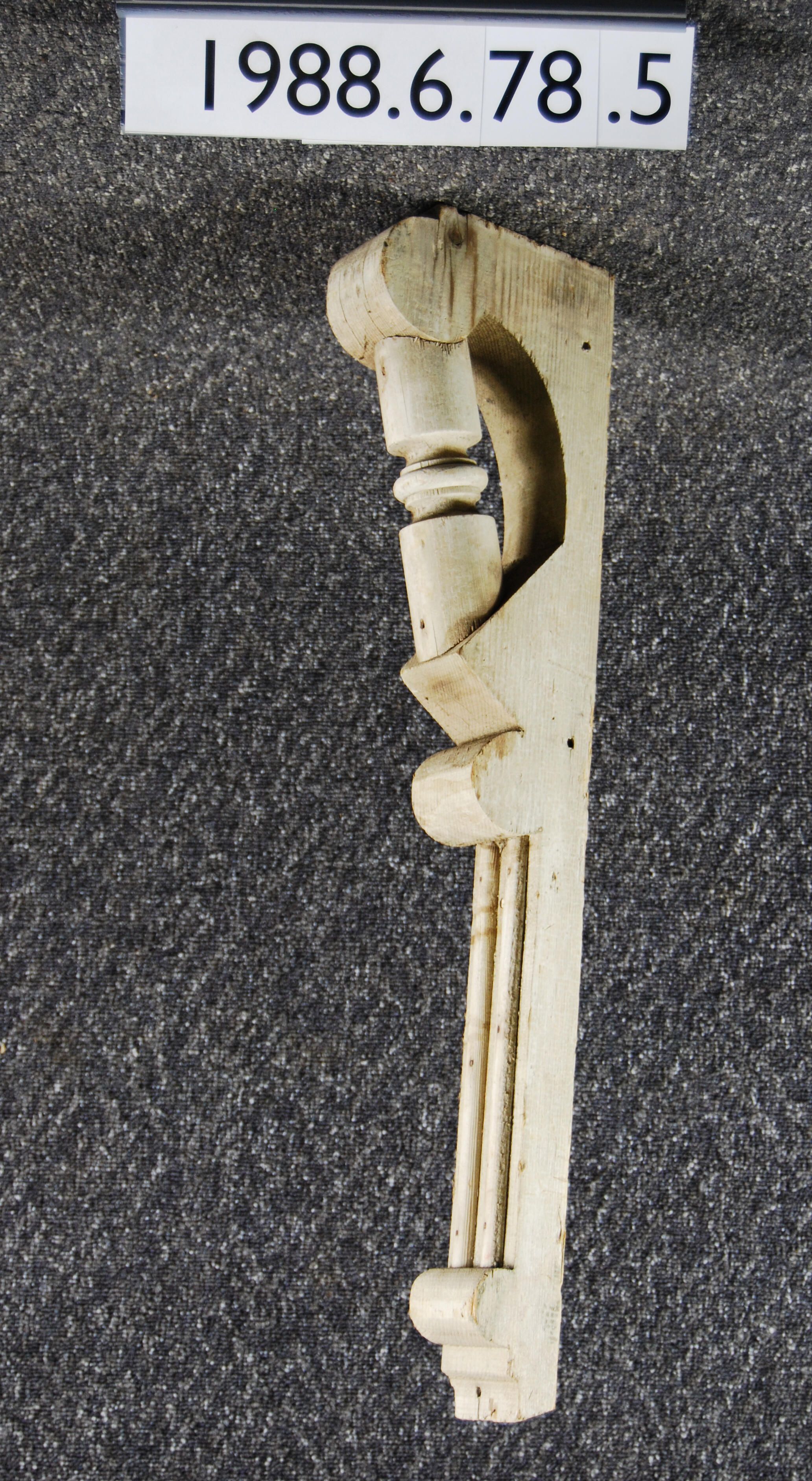 Wood bracket. Single turned spindle near top. Convex moldings applied to lower front. Remnants of paint. Partially stripped. Inscriptions or Markings: Manufacturer: Place of Manufacturer: Design motif: Style: Finish: Painted / Partially Stripped