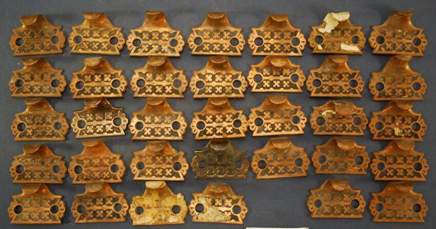 Design Name: Manufacturer: Unknown Style: Aesthetic Material: Iron / Bronze Manufacturing Method: Cast Surface Finish: Aged / Unpolished VDA Classification: VDA Number: Shape: Patent Specifics: Lock Type (If Applicable): Inscription/Makers Mark: Inscription Text: 8077 Comments: Finger lift, condition varies, some bent.