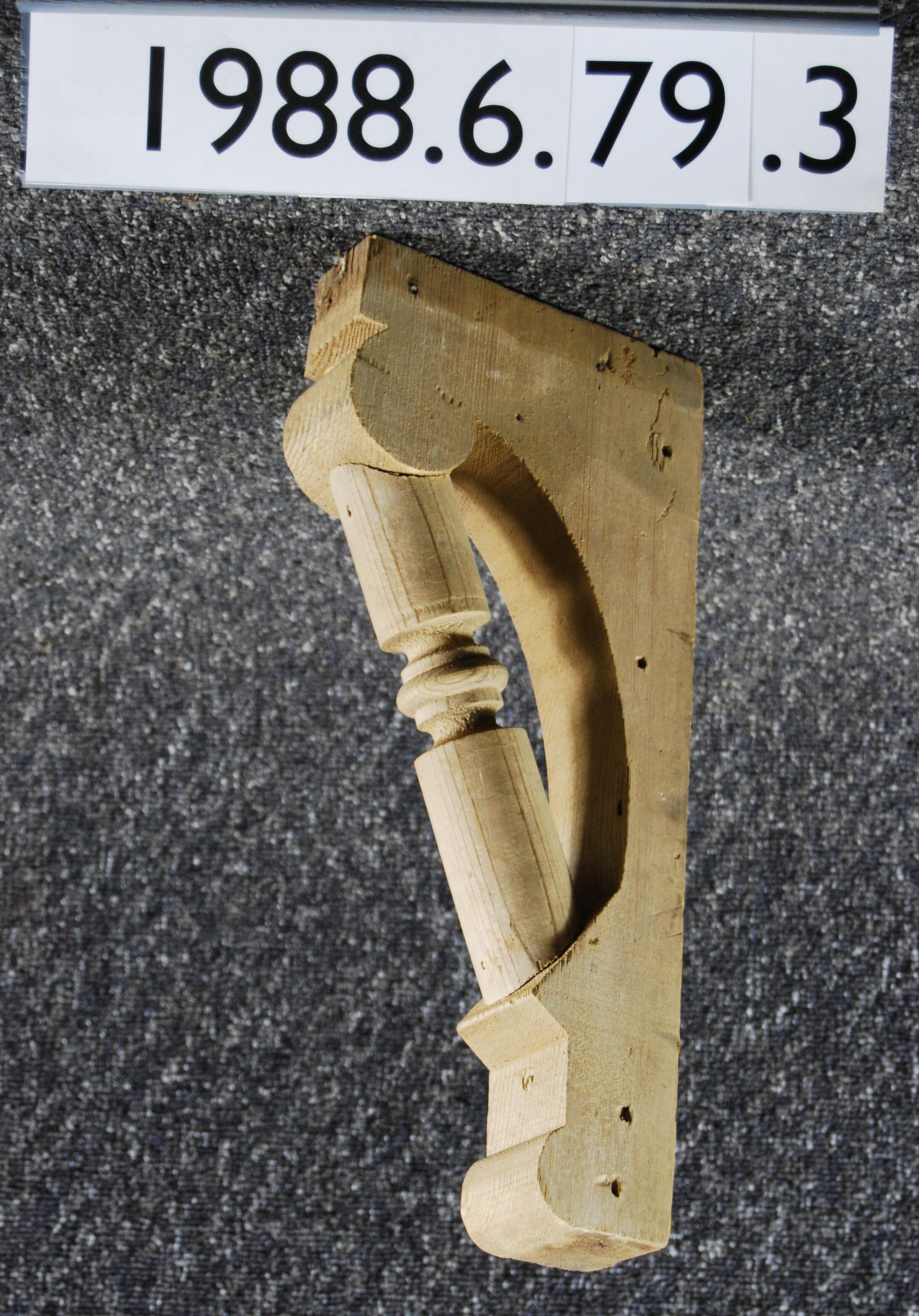 Wood bracket. Single turned spindle. Remnants of paint. Now stripped. Inscriptions or Markings: Manufacturer: Place of Manufacturer: Design motif: Style: Finish: Stripped