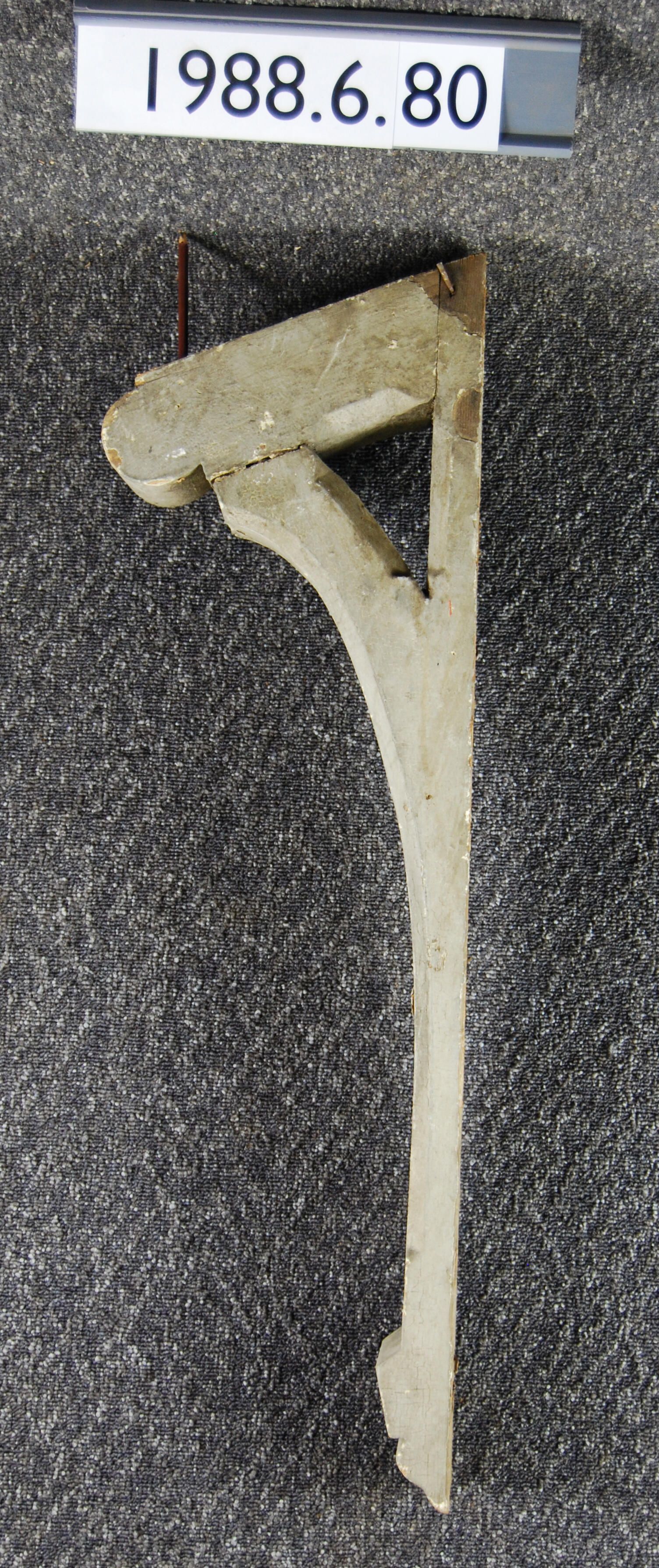 Wood cornice bracket. Curved sides. Angular top. Painted grey. Inscriptions or Markings: Manufacturer: Place of Manufacturer: Design motif: Style: Finish: Painted