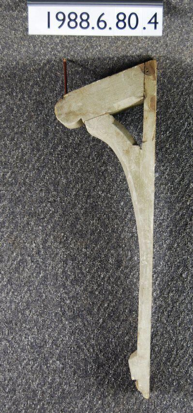 Wood cornice bracket. Curved sides. Angular top. Painted grey. Inscriptions or Markings: Manufacturer: Place of Manufacturer: Design motif: Style: Finish: Painted