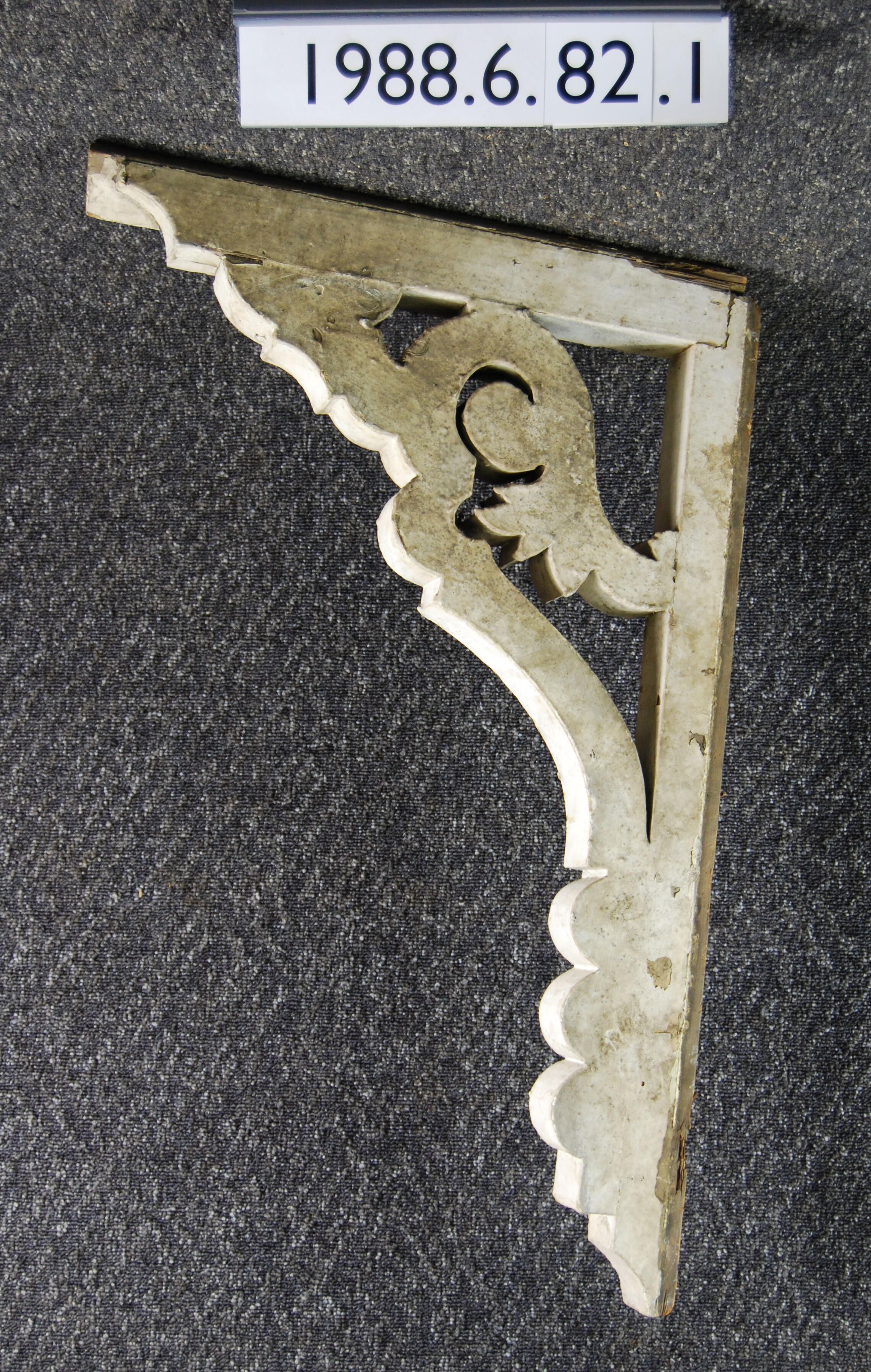 Wood cornice bracket. Top is beveled and has attached cleat. Scrolled sides. Painted white. Inscriptions or Markings: Manufacturer: Place of Manufacturer: Design motif: Style: Finish: Painted